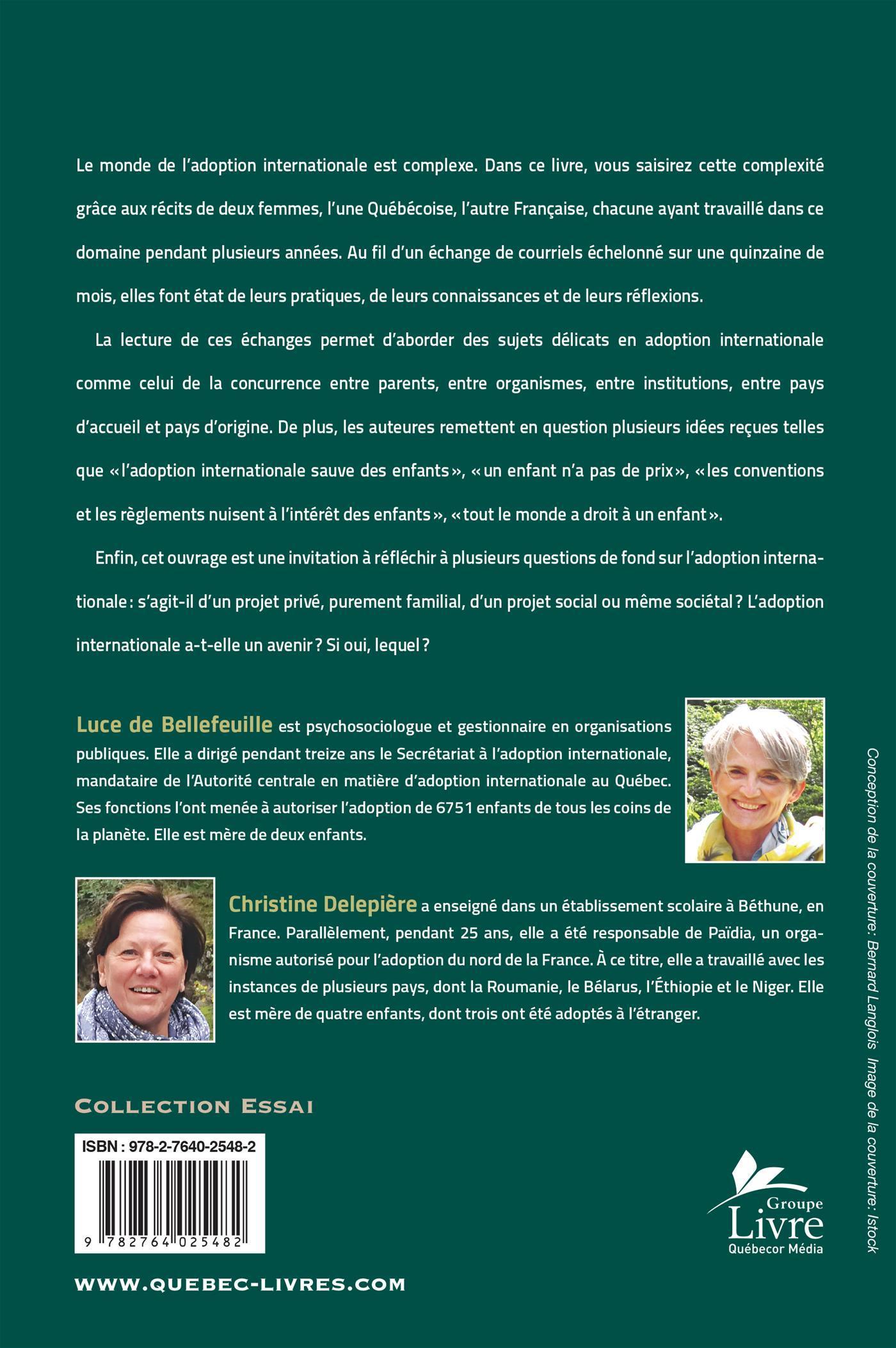 Le monde de l'adoption internationale est complexe. Dans ce livre, vous saisirez cette complexité grâce aux récits de deux femmes, l'une Québécoise, l'autre Française, chacune ayant travaillé dans ce domaine pendant plusieurs années. Au fil d'un échange de courriels échelonné sur une quinzaine de mois, elles font état de leurs pratiques, de leurs connaissances et de leurs réflexions.