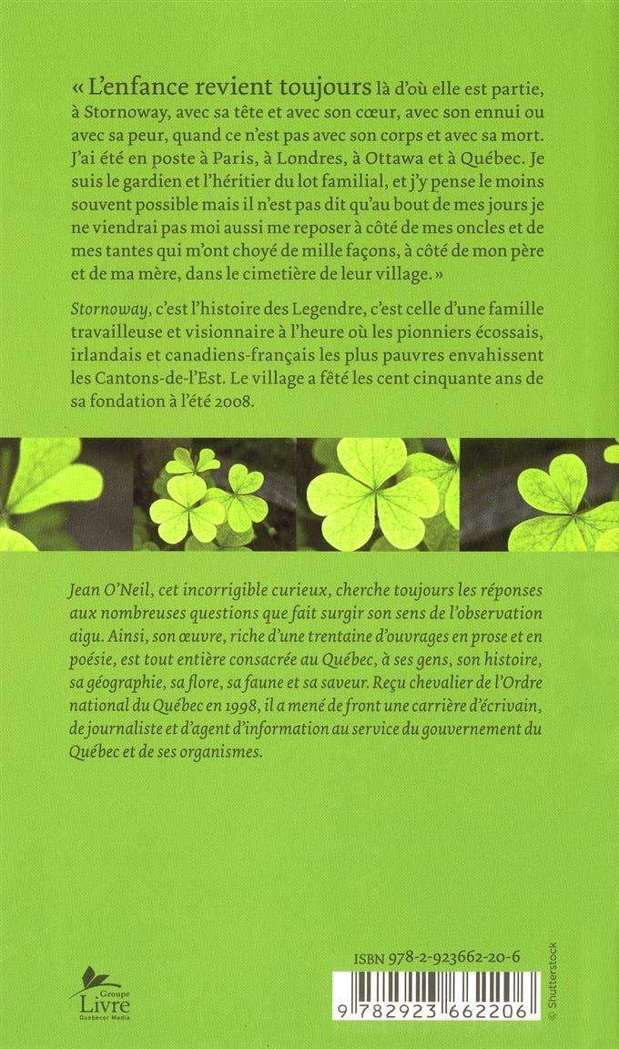 Ellen, la mère, est décédée la première, et Joseph-Alphonse a passé le restant de sa vie à s’ennuyer d’elle. L’un après l’autre, Rose, Keenan, Blanche, Peg, Lou, Bonhomme, Pit et Bijou sont venus les rejoindre au cimetière d’en haut de la côte. Il reste Thérèse, qui va souvent les visiter. Avec son neveu Gérard et son fils Jean, elle raconte ici l’histoire de sa famille, quand son père et ses oncles sont venus s’installer à Stornoway, dans le canton de Winslow, entre Sherbrooke et le lac Mégantic, entre la Beauce et les « États », entre l’âge de la fourrure et l’âge de la bière, en plein dans l’âge du bois. L’histoire des Legendre, c’est celle d’une famille travailleuse et visionnaire à l’heure où les pionniers écossais, irlandais et canadiens français les plus pauvres envahissent les Cantons-de-l’Est.