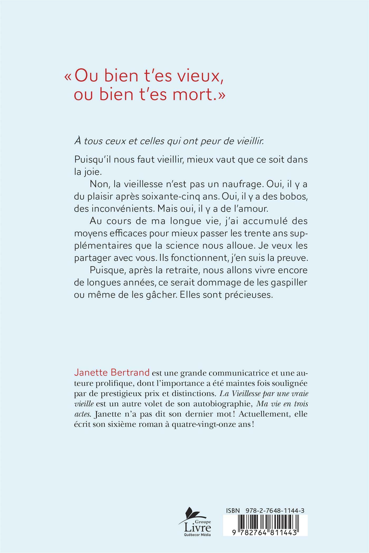 « Ou bien t'es vieux, ou bien t'es mort. » . .À tous ceux et celles qui ont peur de vieillir . .Puisqu'il nous faut vieillir, mieux vaut que ce soit dans la joie. . .Non, la vieillesse n'est pas un naufrage. Oui, il y a du plaisir après soixante-cinq ans. Oui, il y a des bobos, des inconvénients. Mais oui, il y a de l'amour. . .Au cours de ma longue vie, j'ai accumulé des moyens efficaces pour mieux passer les trente ans supplémentaires que la science nous alloue. Je veux les partager avec vous. Ils fonctionnent, j'en suis la preuve. . .Puisque, après la retraite, on va vivre encore de longues années, ce serait dommage de les gaspiller ou même de les gâcher. Elles sont précieuses.
