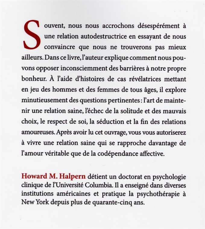Souvent, nous nous accrochons désespérément à une relation autodestructrice en essayant de nous convaincre que nous ne trouverons pas mieux. Dans ce livre, l'auteur explique comment nous pouvons opposer inconsciemment des barrières à notre propre bonheur. À l'aide d'histoires que de cas révélatrices mettant en jeu des hommes et des femmes de tous âges, il explore minutieusement des questions pertinentes: l'art de maintenir une relation saine, l'échec de la solitude et des mauvais choix, le respect de soi, la séduction et la fin des relations amoureuses. Après avoir lu cet ouvrage, vous vous autoriserz à vire une relation saine qui se rapproche davantage de l'amour véritable que de la codépendance affective.