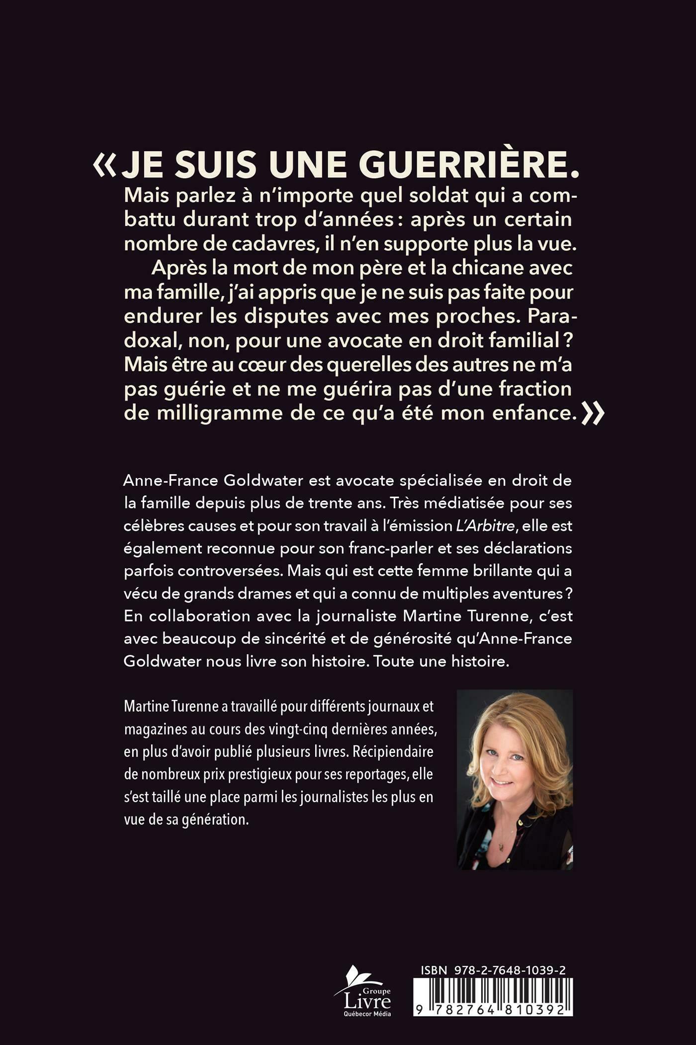 .Anne-France Goldwater est avocate spécialisée en droit de la famille depuis plus de trente ans. Très médiatisée pour ses célèbres causes, elle est également reconnue pour son franc-parler et ses déclarations parfois controversées. Mais qui est cette femme brillante qui a vécu de grands drames, qui a eu de nombreux hommes dans sa vie et qui a connu de multiples aventures ? En collaboration avec la journaliste Martine Turenne, c'est avec beaucoup de sincérité et de générosité qu'Anne-France Goldwater nous livre son histoire. Toute une histoire.
