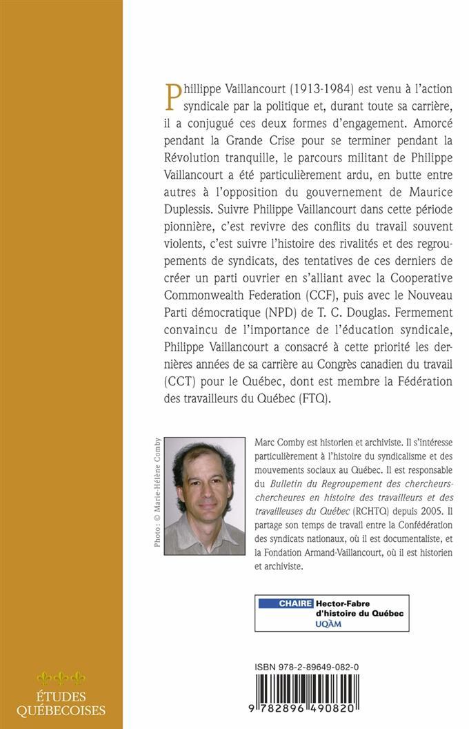 Philippe Vaillancourt (1913-1984) est venu à l'action syndicale par la politique et, durant toute sa carrière, il a conjugué ces deux formes d'engagement. Amorcé pendant la Grande Crise pour se terminer pendant la Révolution tranquille, le parcours militant de Philippe Vaillancourt a été particulièrement ardu, en butte entre autres à l'opposition du gouvernement de Maurice Duplessis. Suivre Philippe Vaillancourt dans cette période pionnière, c'est revivre des conflits du travail souvent violents, c'est suivre l'histoire des rivalités et des regroupements de syndicats, des tentatives de ces derniers de créer un parti ouvrier en s'alliant avec la Cooperative Commonwealth Federation (CCF), puis avec le Nouveau Parti Démocratique (NPD), de T.C. Douglas. Fermement convaincu de l'importance de l'éducation syndicale, Philippe Vaillancourt a consacré à cette priorité les dernières années de sa carrière au Congrès canadien du travail (CCT) pour le Québec, dont est membre la Fédération des travailleurs du Québec (FTQ).