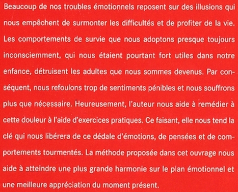 Dans cette suite cohérente à Guérir les traces du passé, Ingeborg Bosch Bonomo nous démontre bien que beaucoup de ces troubles émotionnels reposent sur des illusions qui nous empêchent de surmonter les difficultés et de profiter de la vie. Hélas?! les comportements de survie que nous adoptons presque toujours inconsciemment, qui nous étaient fort utiles dans notre enfance, détruisent les adultes que nous sommes devenus. Par conséquent, nous refoulons trop de sentiments pénibles et nous souffrons plus que nécessaire. Heureusement, Ingeborg Bosch Bonomo nous aide à remédier à cette douleur à l’aide d’exercices pratiques. Ce faisant, elle nous tend la clé qui nous libérera de ce dédale d’émotions, de pensées et de comportements tourmentés. Au final, notre récompense est l’harmonie émotionnelle.