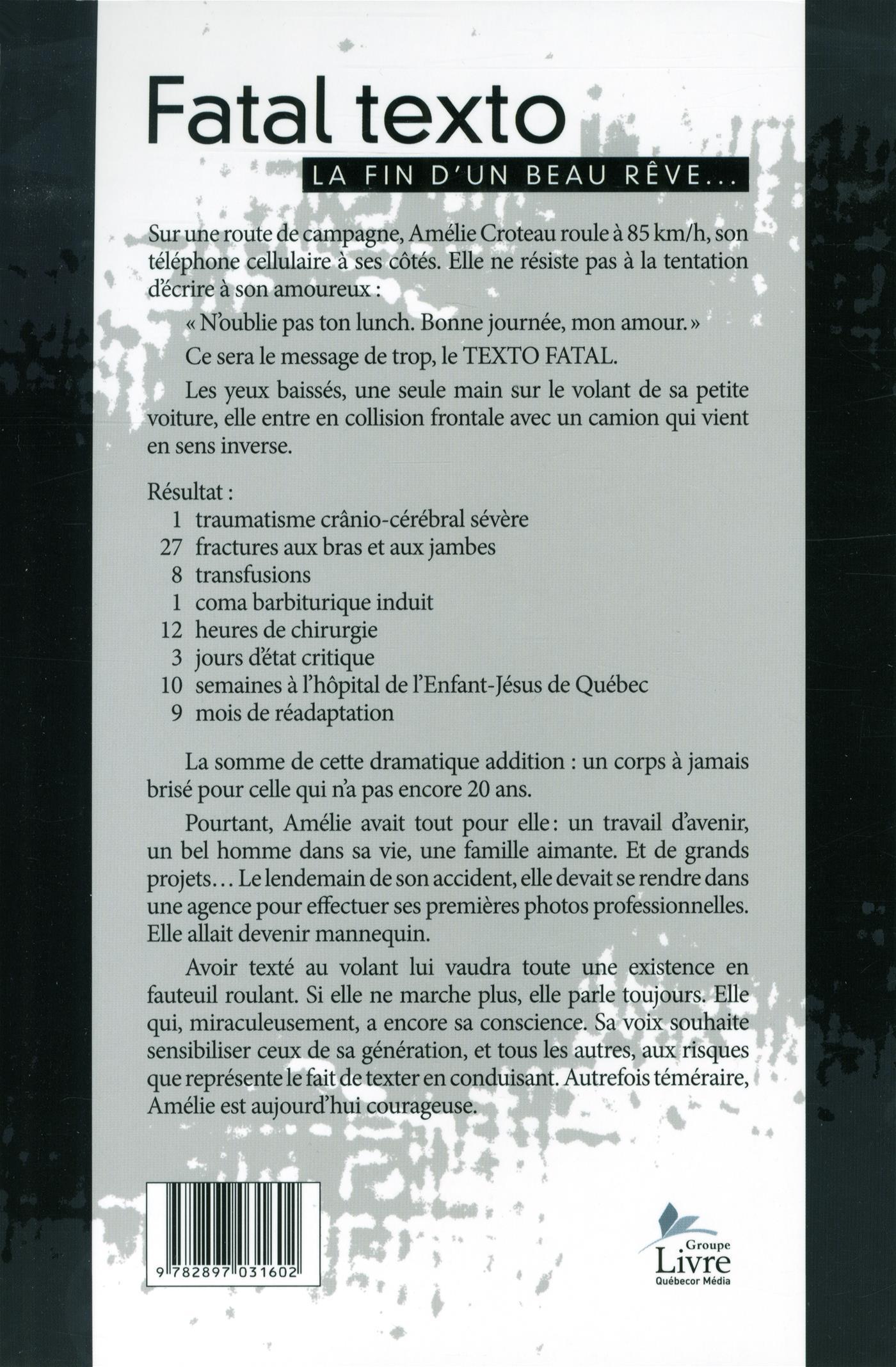 marche plus, elle parle toujours. Elle qui, miraculeusement, a encore sa conscience. Sa voix souhaite sensibiliser ceux de sa génération, et tous les autres, aux risques que représente le fait de texter en conduisant. Autrefois téméraire, Amélie est aujourd'hui courageuse.