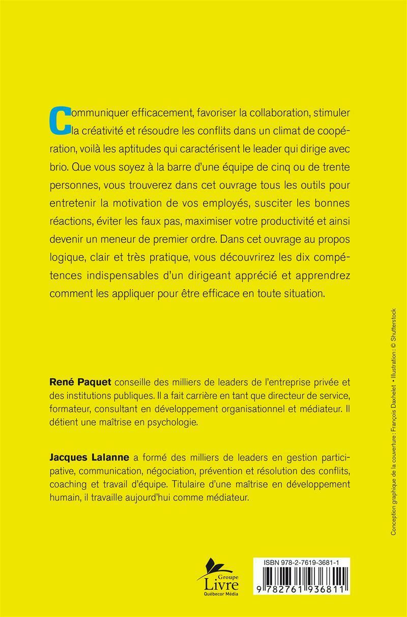 Communiquer efficacement, favoriser la collaboration, stimuler la créativité et résoudre les conflits dans un climat de coopération, voilà les aptitudes qui caractérisent le leader qui dirige avec brio. Que vous soyez à la barre d'une équipe de cinq ou de trente personnes, vous trouverez dans cet ouvrage tous les outils pour entretenir la motivation de vos employés, susciter les bonnes réactions, éviter les faux pas, maximiser votre productivité et ainsi devenir un meneur de premier ordre. Dans cet ouvrage au propos logique, clair et très pratique, vous découvrirez les dix compétences indispensables d'un dirigeant apprécié et apprendrez comment les appliquer pour être efficace en toute situation.
