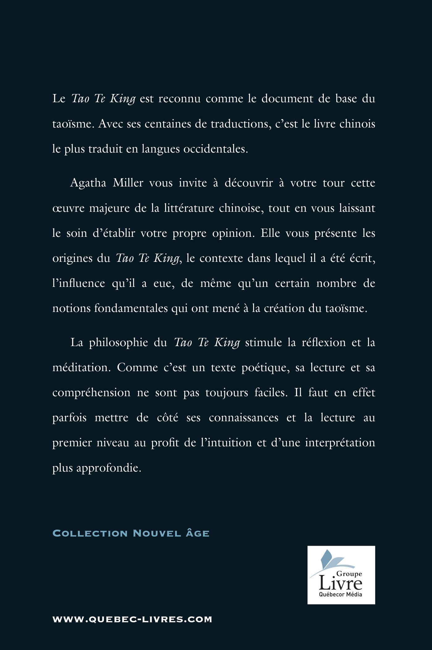 Agatha Miller vous invite à découvrir à votre tour cette œuvre majeure de la littérature chinoise, tout en vous laissant le soin d'établir votre propre opinion. Elle vous présente les origines du Tao Te King, le contexte dans lequel il a été écrit, l'influence qu'il a eue, de même qu'un certain nombre de notions fondamentales qui ont mené à la création du taoïsme.