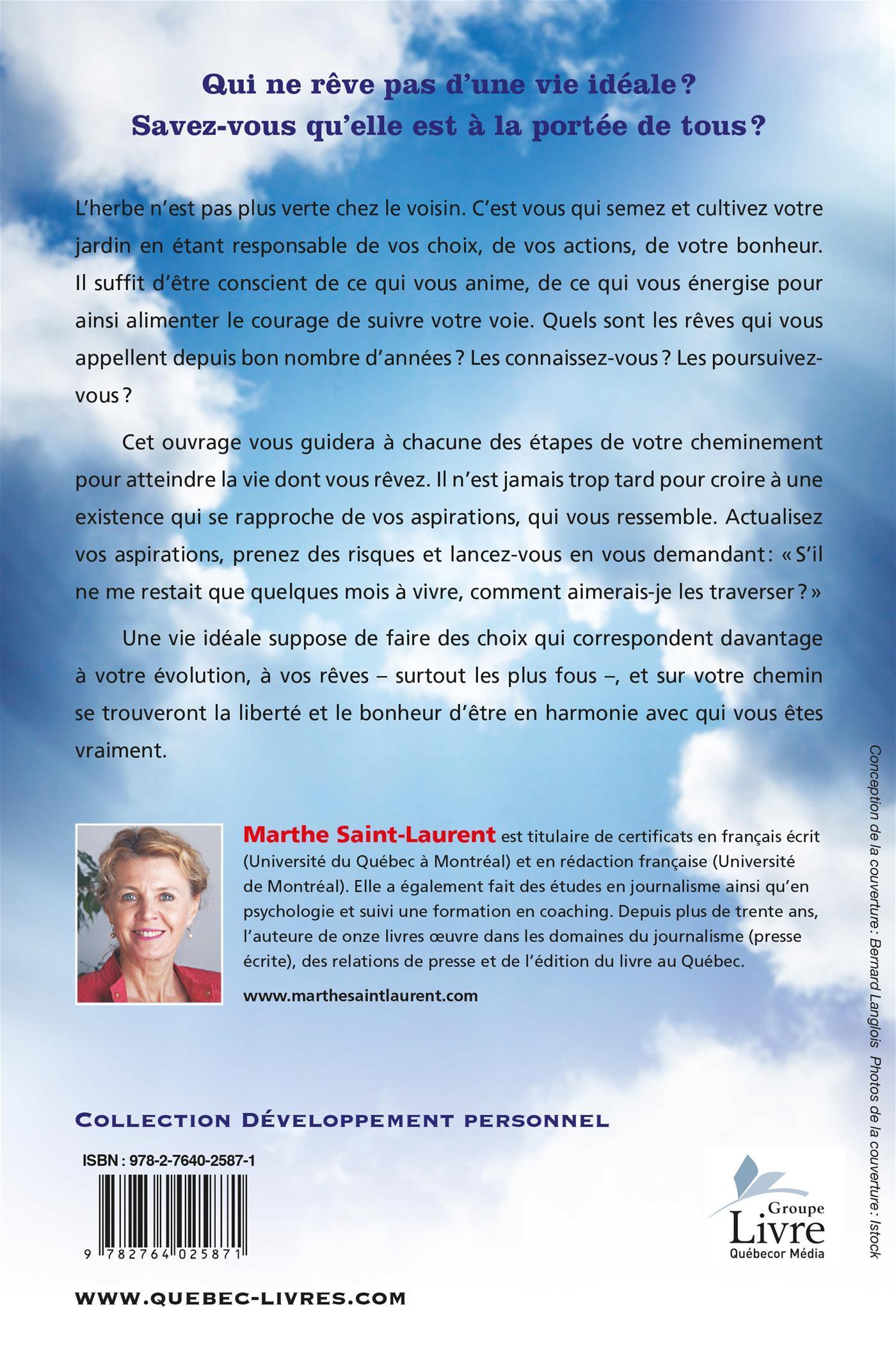Cet ouvrage vous guidera à chacune des étapes de votre cheminement pour atteindre la vie dont vous rêvez. Il n'est jamais trop tard pour croire à une existence qui se rapproche de vos aspirations, qui vous ressemble. Actualisez vos aspirations, prenez des risques et lancez-vous en vous demandant: «S'il ne me restait que quelques mois à vivre, comment aimerais-je les traverser?» Une vie idéale suppose de faire des choix qui correspondent davantage à votre évolution, à vos rêves – surtout les plus fous –, et sur votre chemin se trouveront la liberté et le bonheur d'être en harmonie avec qui vous êtes vraiment.