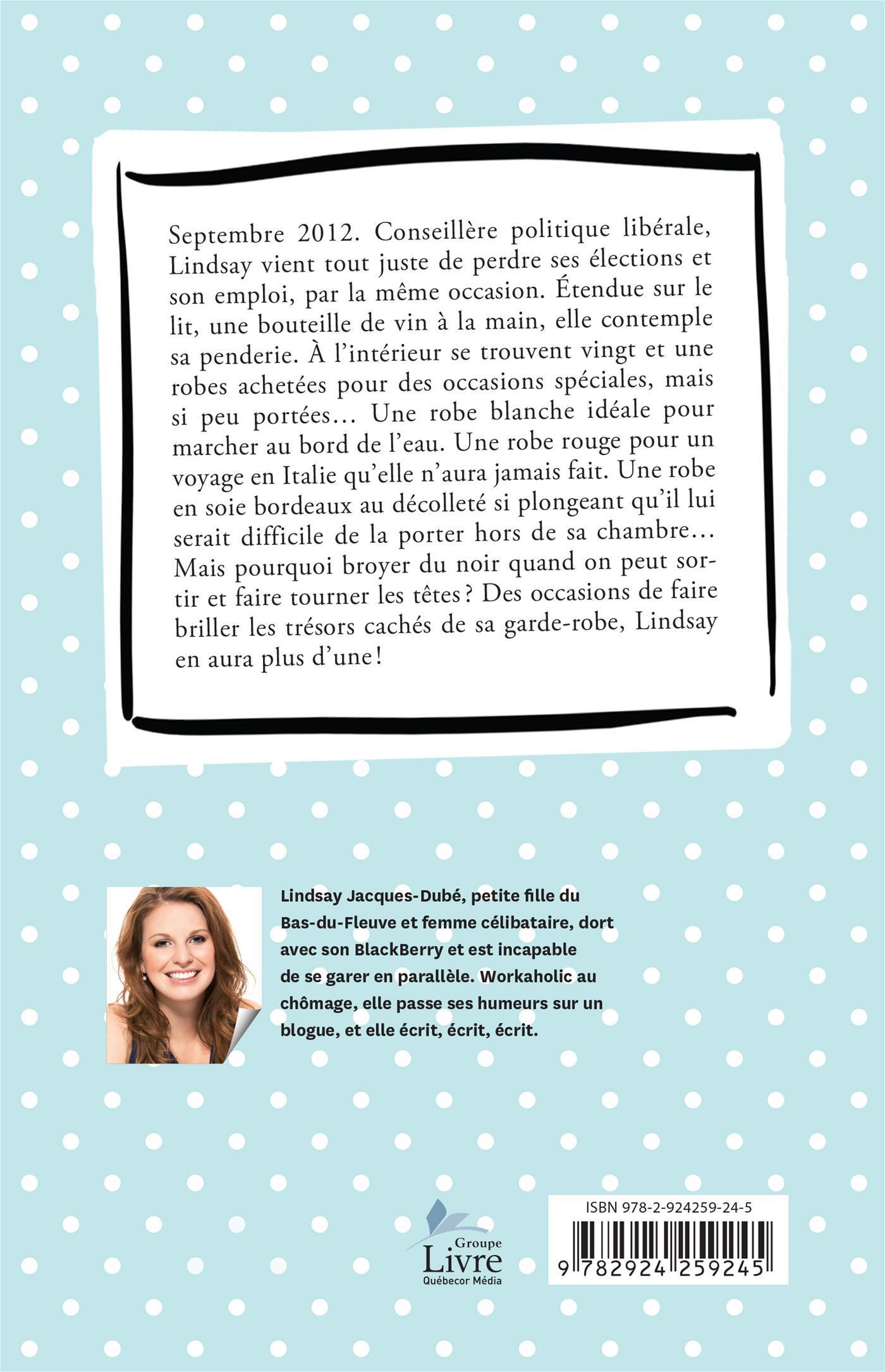 "Septembre 2012. Conseillère politique libérale, Lindsay vient tout juste de perdre ses élections et son emploi, par la même occasion. Étendue sur le lit, une bouteille de vin à la main, elle contemple sa penderie. À l'intérieur se trouvent vingt et une robes achetées pour des occasions spéciales, mais si peu portées… Une robe blanche idéale pour marcher au bord de l'eau. Une robe rouge pour un voyage en Italie qu'elle n'aura jamais fait. Une robe en soie bordeaux au décolleté si plongeant qu'il lui serait difficile de la porter hors de sa chambre… Mais pourquoi broyer du noir quand on peut sortir et faire tourner les têtes? Des occasions de faire briller les trésors cachés de sa garde-robe, Lindsay en aura plus d'une!"