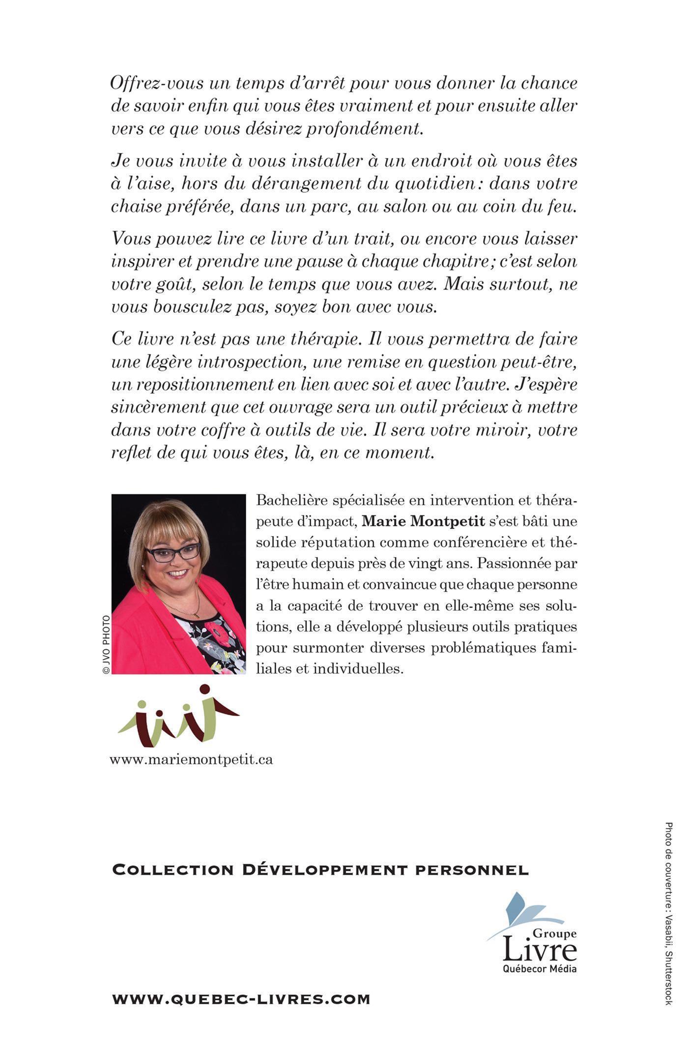 .Ce livre n'est pas une thérapie. Il vous permettra de faire une légère introspection, une remise en question peut-être, un repositionnement en lien avec soi et avec l'autre. J'espère sincèrement que cet ouvrage sera un outil précieux à mettre dans votre coffre à outils de vie. Il sera votre miroir, votre reflet de qui vous êtes, là, en ce moment.