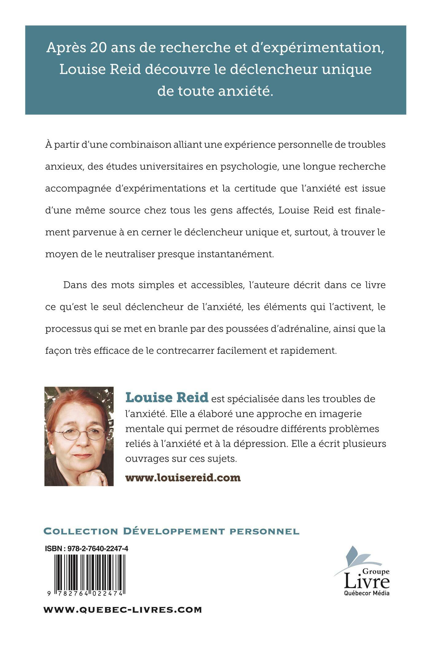 ..À partir d'une combinaison alliant une expérience personnelle de troubles anxieux, des études universitaires en psychologie, une longue recherche accompagnée d'expérimentations et la certitude que l'anxiété est issue d'une même source chez tous les gens affectés, Louise Reid est finalement parvenue à en cerner le déclencheur unique et, surtout, à trouver le moyen de le neutraliser presque instantanément.