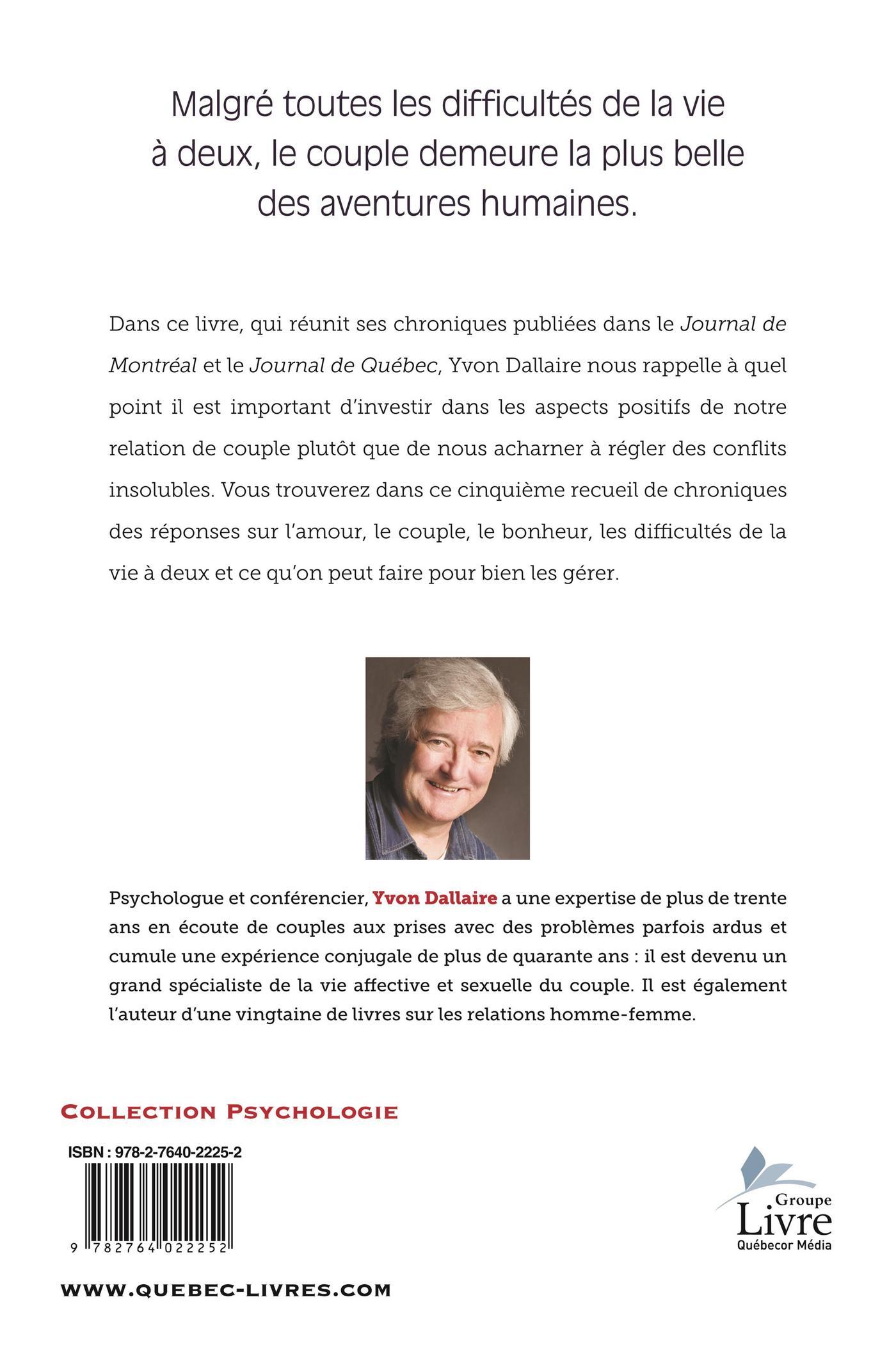 Dans ce livre, qui réunit ses chroniques publiées dans le Journal de Montréal et le Journal de Québec, Yvon Dallaire nous rappelle à quel point il est important d'investir dans les aspects positifs de notre relation de couple plutôt que de nous acharner à régler des conflits insolubles. Vous trouverez dans ce cinquième recueil de chroniques des réponses sur l'amour, le couple, le bonheur, les difficultés de la vie à deux et ce qu'on peut faire pour bien les gérer.