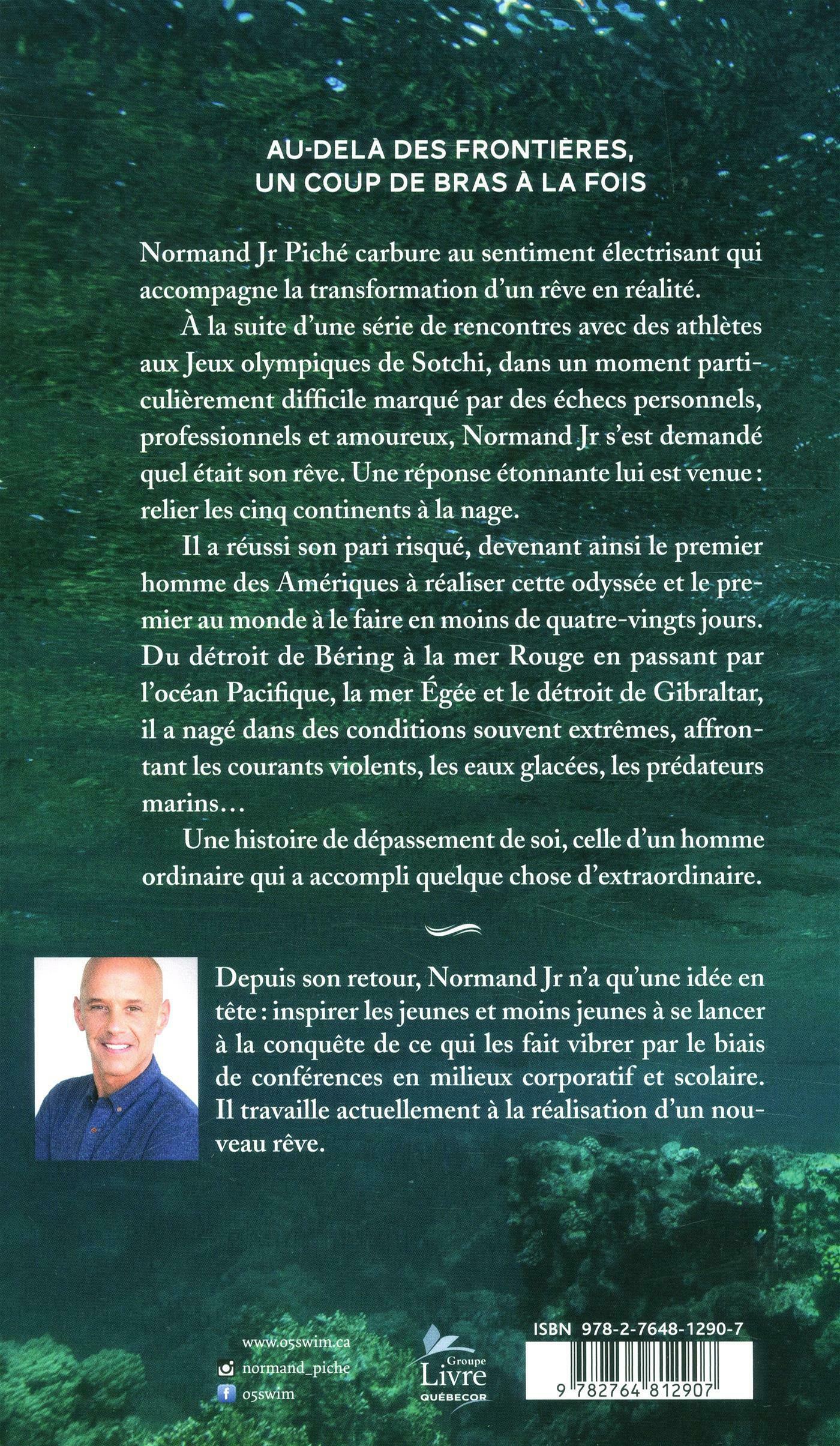 Au-delà des frontières, un coup de bras à la fois. . .Normand Jr Piché carbure au sentiment électrisant qui accompagne la transformation d'un rêve en réalité. . .À la suite d'une série de rencontres avec des athlètes aux Jeux olympiques de Sotchi, dans un moment particulièrement difficile marqué par des échecs personnels, professionnels et amoureux, Normand Jr s'est demandé quel était son rêve. Une réponse étonnante lui est venue : relier les cinq continents à la nage. . .Il a réussi son pari risqué, devenant ainsi le premier homme des Amériques à réaliser cette odyssée et le premier au monde à le faire en moins de quatre-vingts jours. Du détroit de Béring à la mer Rouge en passant par l'océan Pacifique, la mer Égée et le détroit de Gibraltar, il a nagé dans des conditions souvent extrêmes, affrontant les courants violents, les eaux glacées, les prédateurs marins… . .Une histoire de dépassement de soi, celle d'un homme ordinaire qui a accompli quelque chose d'extraordinaire.