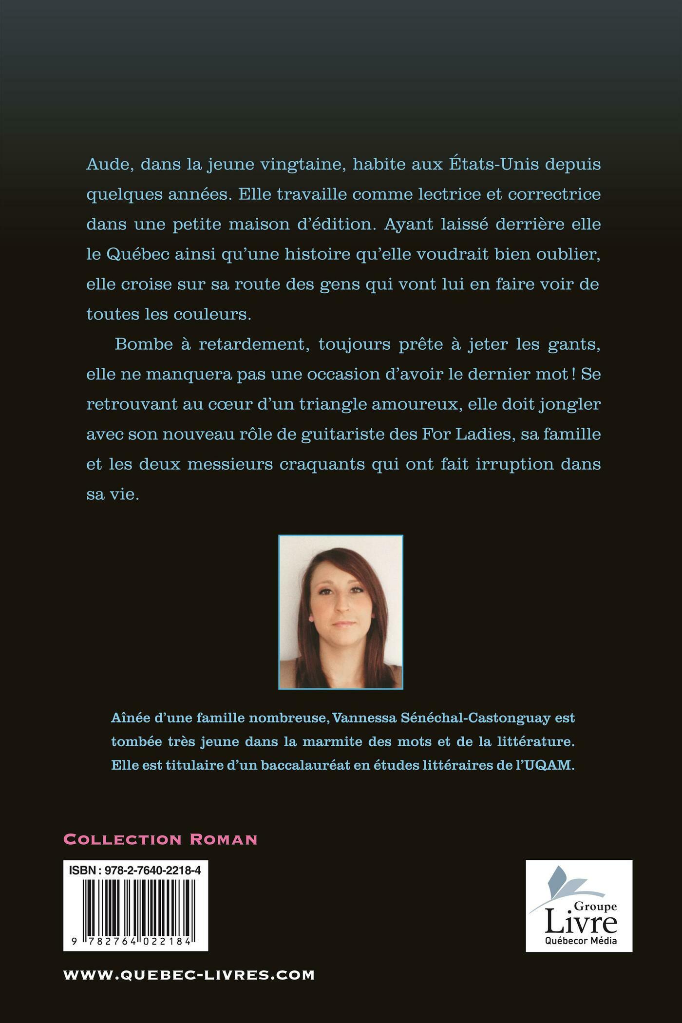 Aude, dans la jeune vingtaine, habite aux États-Unis depuis quelques années. Elle travaille comme lectrice et correctrice dans une petite maison d'édition. Ayant laissé derrière elle le Québec ainsi qu'une histoire qu'elle voudrait bien oublier, elle croise sur sa route des gens qui vont lui en faire voir de toutes les couleurs. . . Bombe à retardement, toujours prête à jeter les gants, elle ne manquera pas une occasion d'avoir le dernier mot ! Se retrouvant au cœur d'un triangle amoureux, elle doit jongler avec son nouveau rôle de guitariste des For Ladies, sa famille et les deux messieurs craquants qui ont fait irruption dans sa vie. . . Aînée d'une famille nombreuse, Vannessa Sénéchal-Castonguay est tombée très jeune dans la marmite des mots et de la littérature. Elle est titulaire d'un baccalauréat en études littéraires de l'UQAM. . .