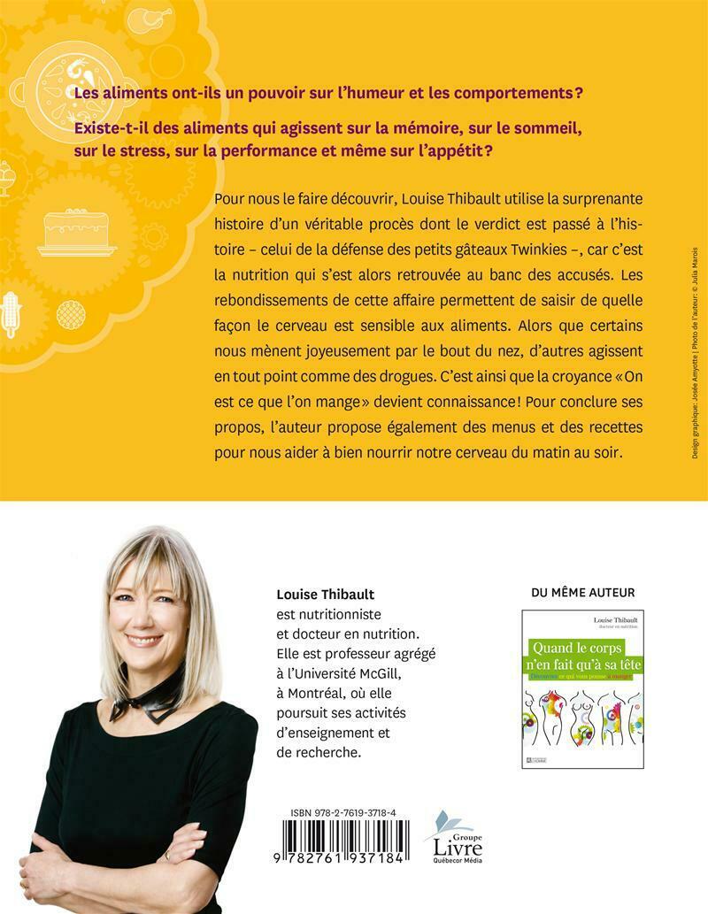 Pour nous le faire découvrir, Louise Thibault utilise la surprenante histoire d'un véritable procès dont le verdict est passé à l'histoire – celui de la défense des petits gâteaux Twinkies –, car c'est la nutrition qui s'est alors retrouvée au banc des accusés. Les rebondissements de cette affaire permettent de saisir de quelle façon le cerveau est sensible aux aliments. Alors que certains nous mènent joyeusement par le bout du nez, d'autres agissent en tout point comme des drogues. C'est ainsi que la croyance «On est ce que l'on mange» devient connaissance! Pour conclure ses propos, l'auteur propose également des menus et des recettes pour nous aider à bien nourrir notre cerveau du matin au soir.
