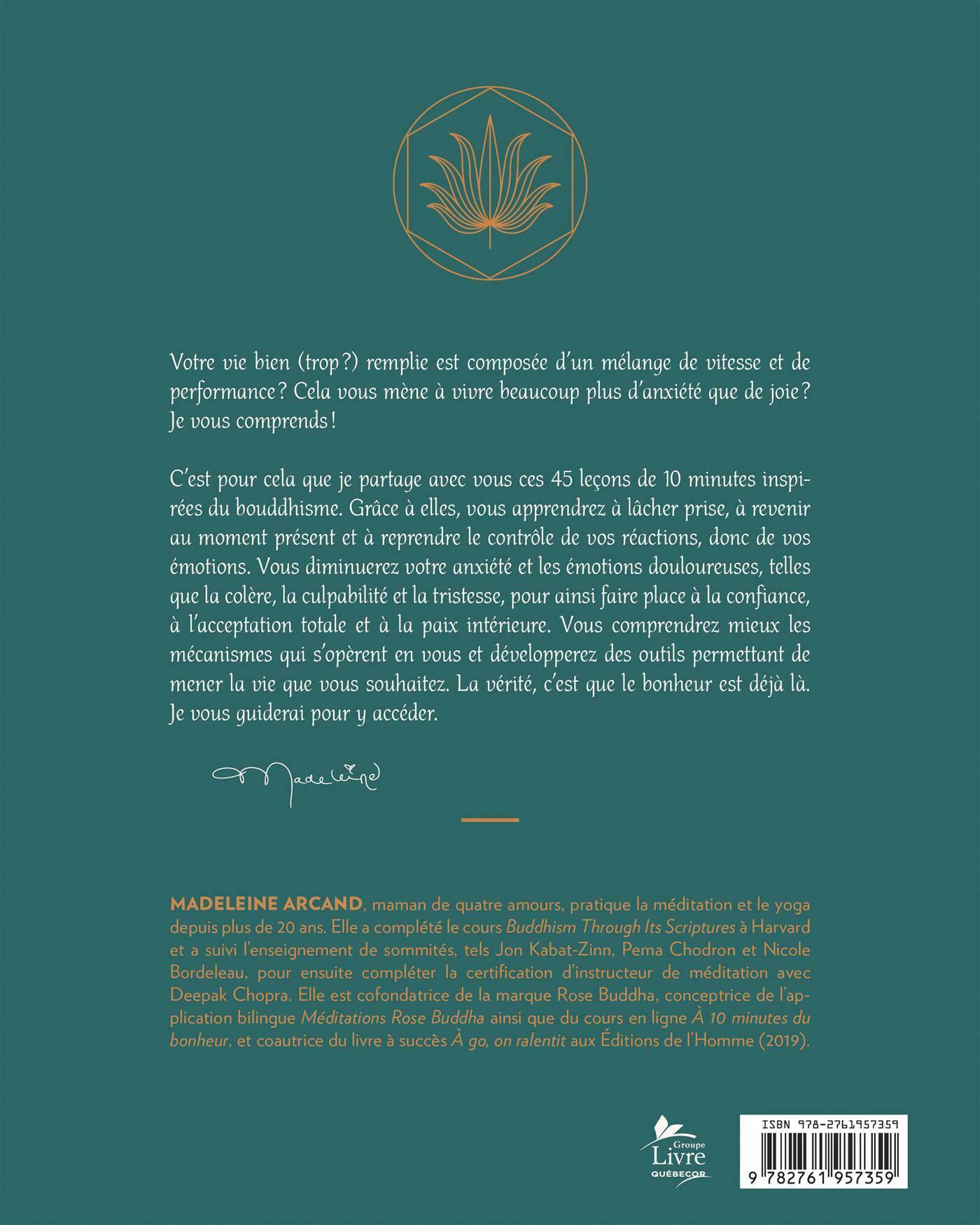 C'est pour cela que je partage avec vous ces 45 leçons de 10 minutes inspirées du bouddhisme. Grâce à elles, vous apprendrez à lâcher prise, à revenir au moment présent et à reprendre le contrôle de vos réactions, donc de vos émotions. Vous diminuerez votre anxiété et les émotions douloureuses, telles que la colère, la culpabilité et la tristesse, pour ainsi faire place à la confiance, à l'acceptation totale et à la paix intérieure. Vous comprendrez mieux les mécanismes qui s'opèrent en vous et développerez des outils permettant de mener la vie que vous souhaitez.