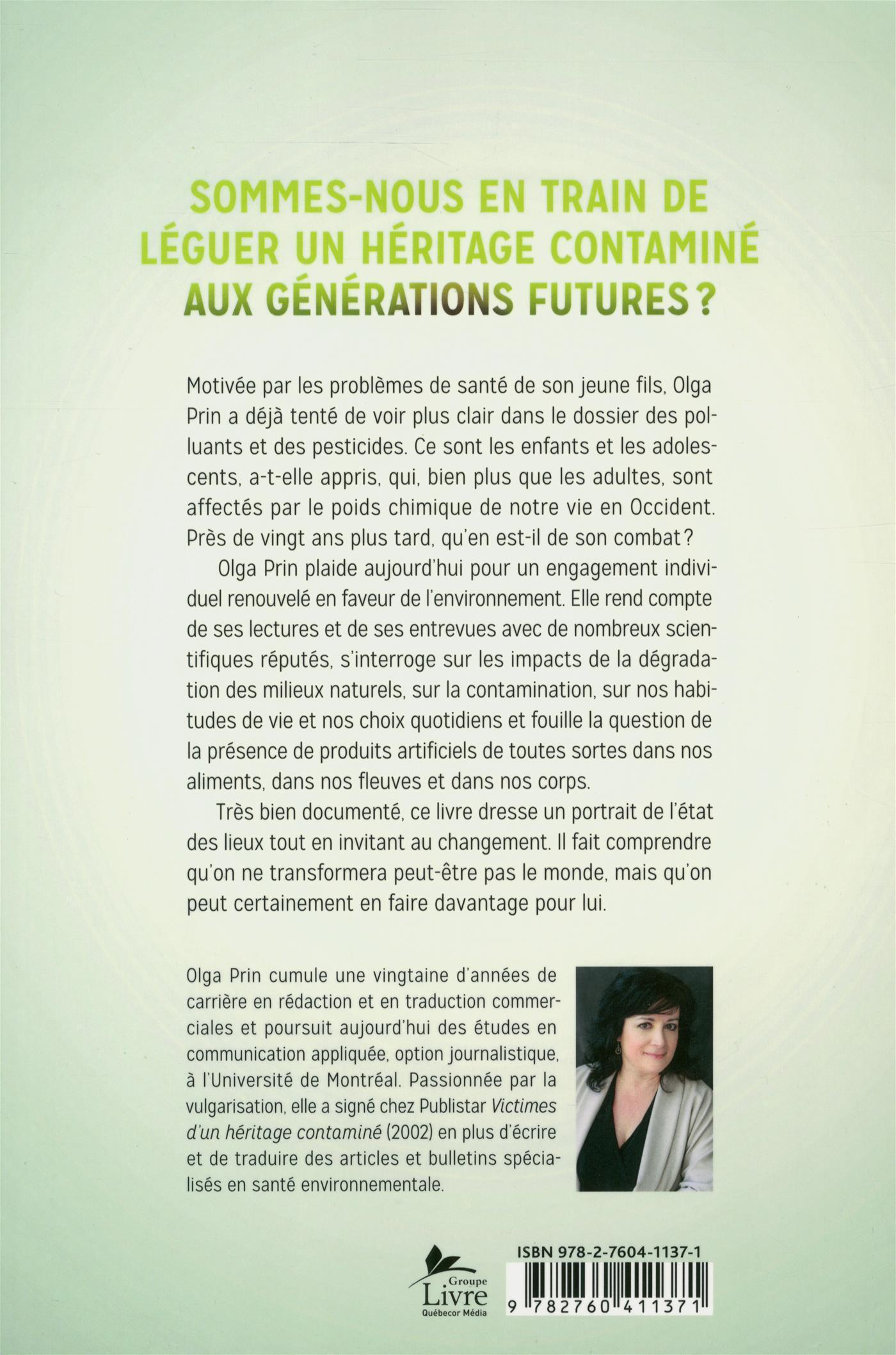 Olga Prin plaide aujourd'hui pour un engagement individuel renouvelé en faveur de l'environnement. Elle rend compte de ses lectures et de ses entrevues avec de nombreux scientifiques réputés, s'interroge sur les impacts de la dégradation des milieux naturels, sur la contamination, sur nos habitudes de vie et nos choix quotidiens et fouille la question de la présence de produits artificiels de toutes sortes dans nos aliments, dans nos fleuves et dans nos corps.