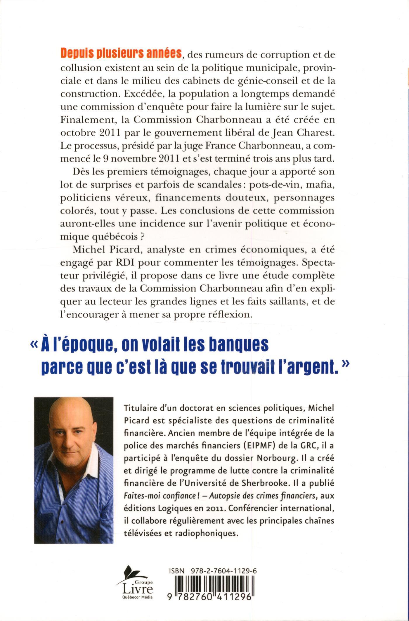 Michel Picard, analyste en crimes économiques, a été engagé par RDI pour commenter les témoignages. Spectateur privilégié, il propose dans ce livre une étude complète des travaux de la Commission Charbonneau afin d'en expliquer au lecteur les grandes lignes et les faits saillants, et de l'encourager à mener sa propre réflexion.