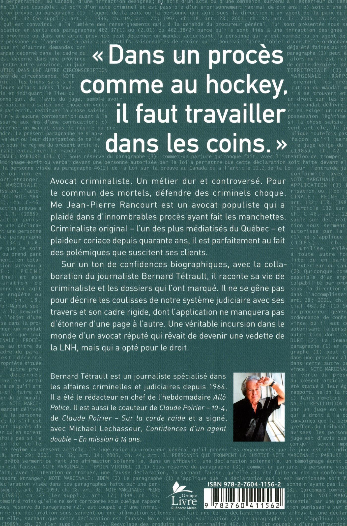 Sur un ton de confidences biographiques, avec la collaboration du journaliste Bernard Tétrault, il raconte sa vie de criminaliste et les dossiers qui l'ont marqué. Il ne se gêne pas pour décrire les coulisses de notre système judiciaire avec ses travers et son cadre rigide, dont l'application ne manquera pas d'étonner d'une page à l'autre. Une véritable incursion dans le monde d'un avocat réputé qui rêvait de devenir une vedette de la LNH, mais qui a opté pour le droit.