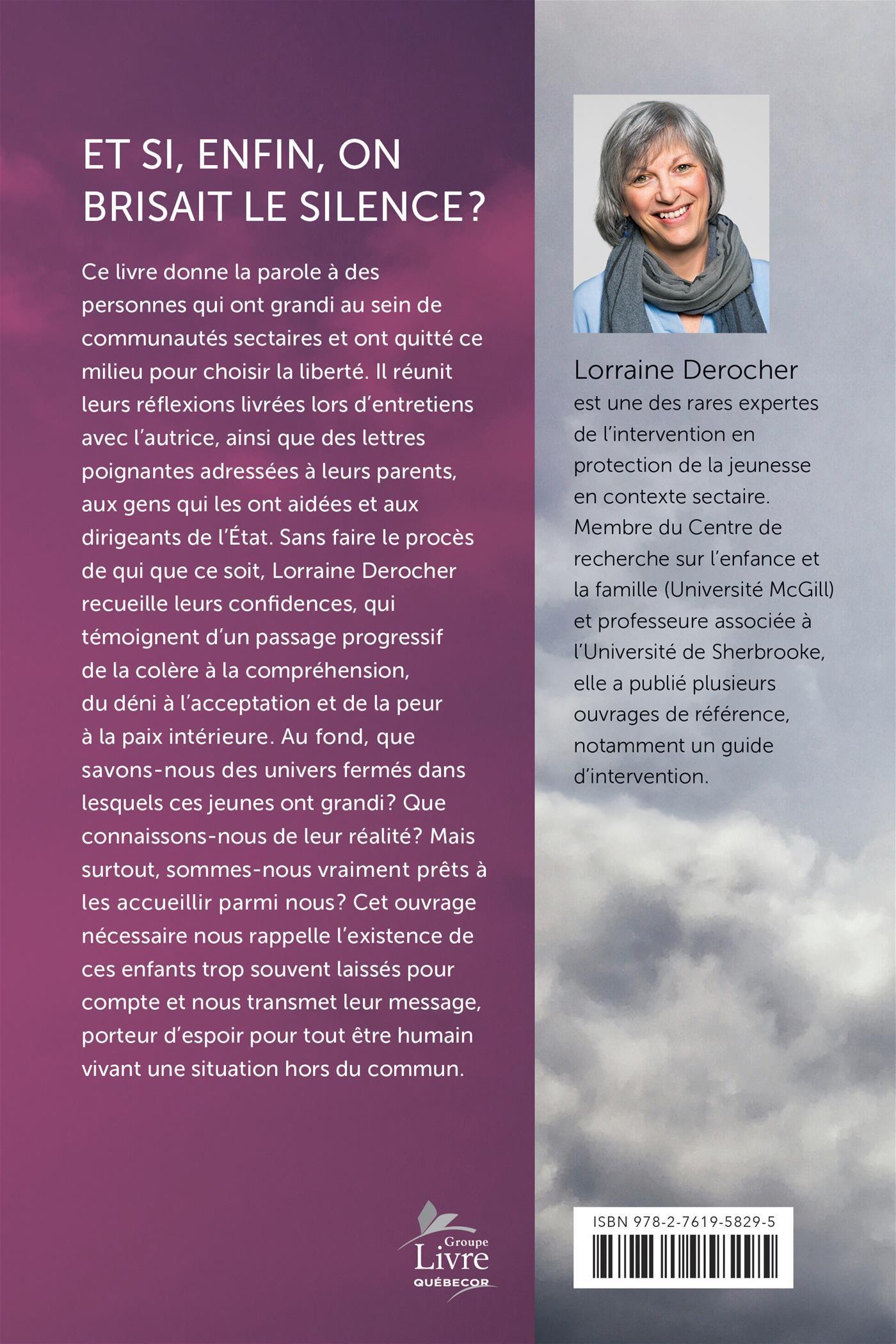 Ce livre donne la parole à des personnes qui ont grandi au sein de communautés sectaires et ont quitté ce milieu pour choisir la liberté. Il réunit leurs réflexions livrées lors d'entretiens avec l'autrice, ainsi que des lettres poignantes adressées à leurs parents, aux gens qui les ont aidées et aux dirigeants de l'État.