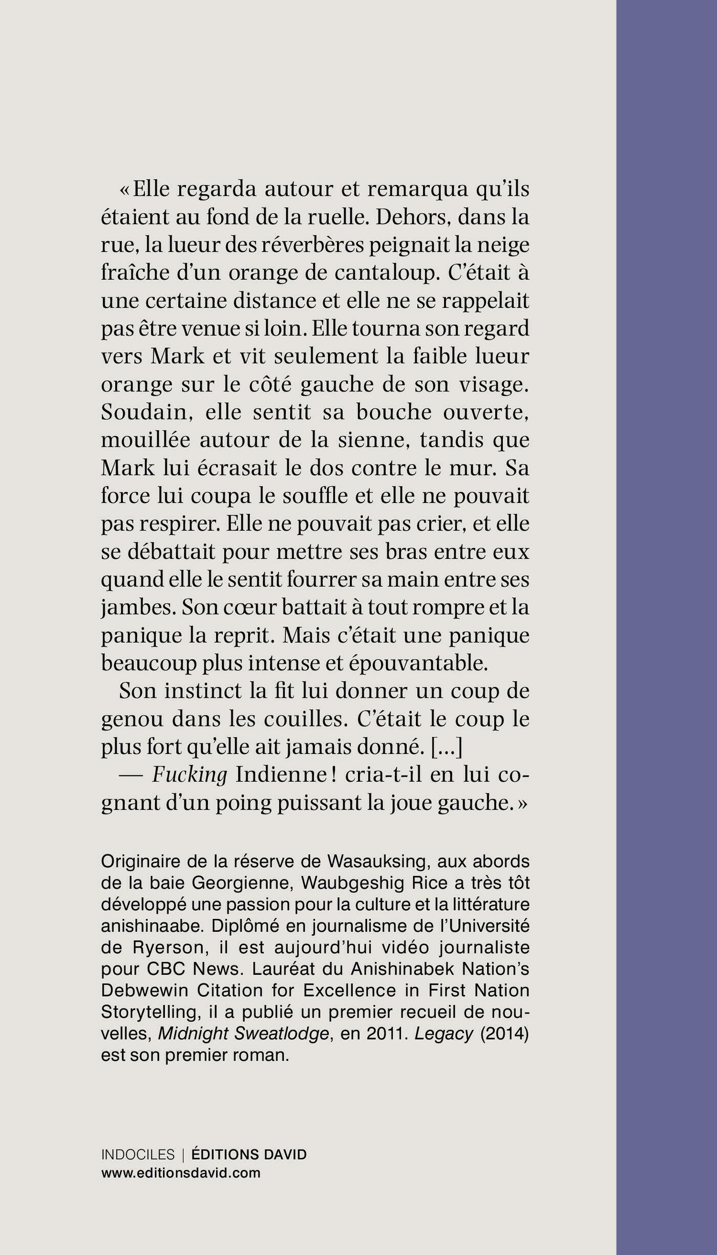 «Elle regarda autour et remarqua qu’ils étaient au fond de la ruelle. Dehors, dans la rue, la lueur des réverbères peignait la neige fraîche d’un orange de cantaloup. C’était à une certaine distance et elle ne se rappelait pas être venue si loin. Elle tourna son regard vers Mark et vit seulement la faible lueur orange sur le côté gauche de son visage. Soudain, elle sentit sa bouche ouverte, mouillée autour de la sienne, tandis que Mark lui écrasait le dos contre le mur. Sa force lui coupa le souffle et elle ne pouvait pas respirer. Elle ne pouvait pas crier, et elle se débattait pour mettre ses bras entre eux quand elle le sentit fourrer sa main entre ses jambes. Son cœur battait à tout rompre et la panique la reprit. Mais c’était une panique beaucoup plus intense et épouvantable. Son instinct la fit lui donner un coup de genou dans les couilles. C’était le coup le plus fort qu’elle ait jamais donné. […] — Fucking indienne! cria-t-il en lui cognant d’un poing puissant la joue gauche.»