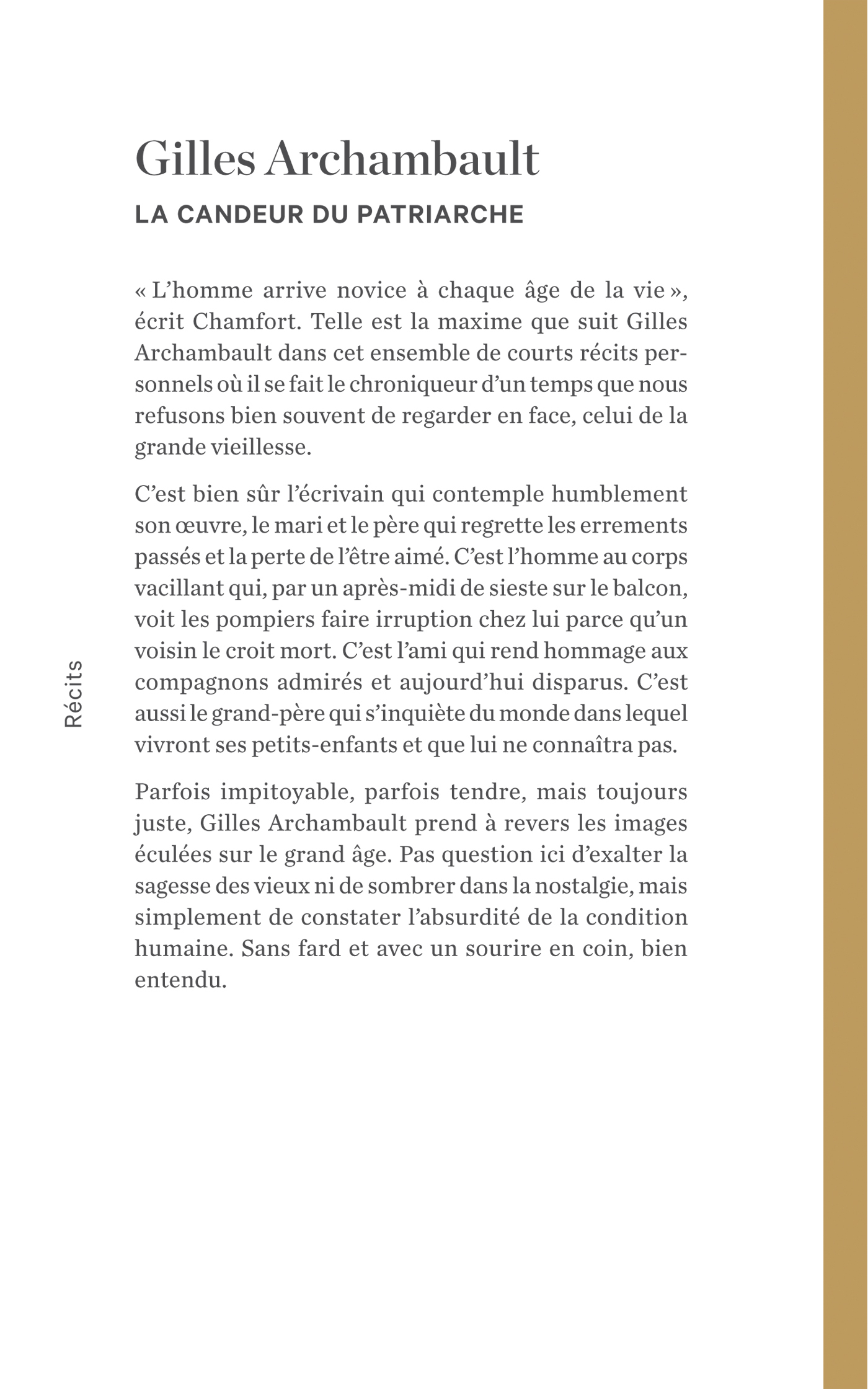 « L’homme arrive novice à chaque âge de la vie », écrit Chamfort. Telle est la maxime que suit Gilles Archambault dans cet ensemble de courts récits personnels où il se fait le chroniqueur d’un temps que nous refusons bien souvent de regarder en face, celui de la grande vieillesse. Avec une autodérision qui n’appartient qu’à lui et une candeur qui a tout de la franchise, il pose tour à tour son regard sur ces petits moments qui, au crépuscule, sont tout ce qui subsiste d’une vie longuement vécue. C’est bien sûr l’écrivain qui contemple humblement son œuvre, le mari et le père qui regrette les errements passés et la perte de l’être aimé. C’est l’homme au corps vacillant qui, par un après-midi de sieste sur le balcon, voit les pompiers faire irruption chez lui parce qu’un voisin le croit mort. C’est l’ami qui rend hommage aux compagnons admirés et aujourd’hui disparus. C’est aussi le grand-père qui s’inquiète du monde dans lequel vivront ses petits-enfants et que lui ne connaîtra pas. Parfois impitoyable, parfois tendre, mais toujours juste, Gilles Archambault prend à revers les images éculées sur le grand âge. Pas question ici d’exalter la sagesse des vieux ni de sombrer dans la nostalgie, mais simplement de constater l’absurdité de la condition humaine. Sans fard et avec un sourire en coin, bien entendu.