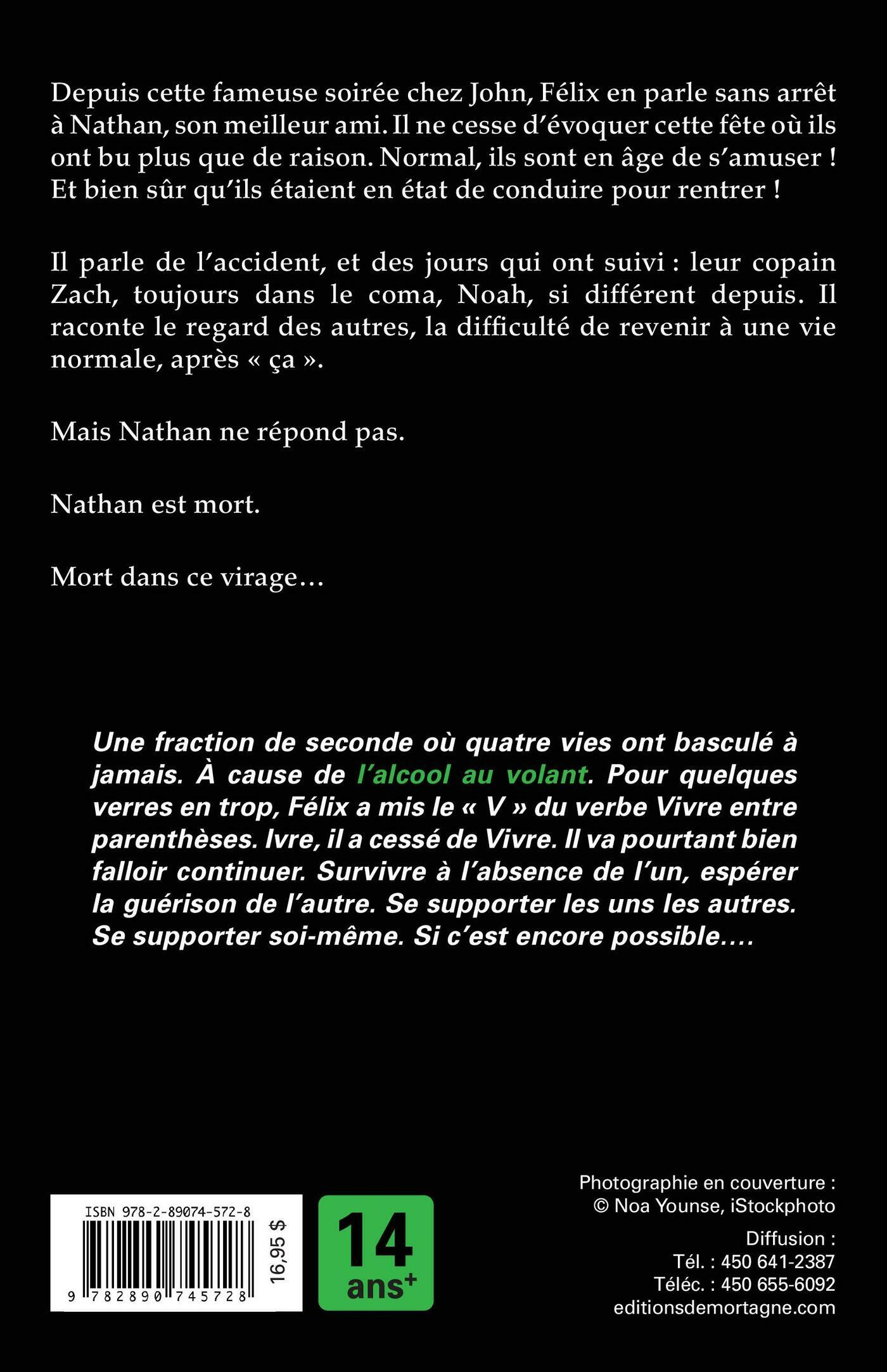 Depuis cette fameuse soirée chez John, Félix en parle sans arrêt à Nathan, son meilleur ami. Il ne cesse d'évoquer cette fête où ils ont bu plus que de raison. Normal, ils sont en âge de s'amuser! Et bien sûr qu'ils étaient en état de conduire pour rentrer!Il parle de l'accident, et des jours qui ont suivi: leur copain Zach, toujours dans le coma, Noah, si différent depuis. Il raconte le regard des autres, la difficulté de revenir à une vie normale, après «ça».Mais Nathan ne répond pas.Nathan est mort.Mort dans ce virage...Une fraction de seconde où quatre vies ont basculé à jamais. À cause de l’alcool au volant. Pour quelques verres en trop, Félix a mis le V du verbe Vivre entre parenthèses. Ivre, il a cessé de Vivre. Il va pourtant bien falloir continuer. Survivre à l’absence de l’un, espérer la guérison de l’autre. Se supporter les uns les autres. Se supporter soi-même. Si c’est encore possible…