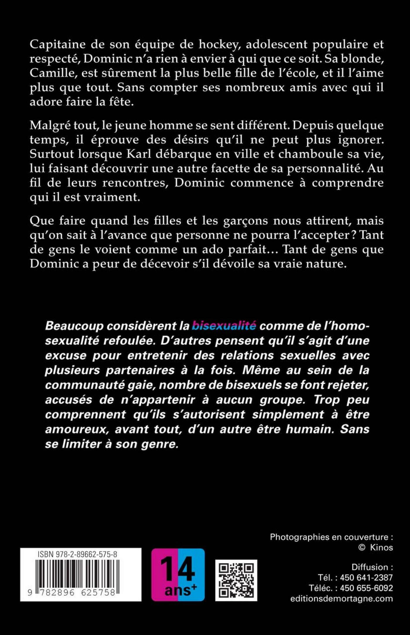 Capitaine de son équipe de hockey, adolescent populaire et respecté, Dominic n'a rien à envier à qui que ce soit. Sa blonde, Camille, est sûrement la plus belle fille de l'école, et il l'aime plus fort que tout. Sans compter ses nombreux amis avec qui il adore faire la fête.Malgré tout, le jeune homme se sent différent. Depuis quelque temps, il éprouve des désirs qu'il ne peut plus ignorer. Surtout lorsque Karl débarque en ville et chamboule sa vie, lui faisant découvrir une autre facette de sa personnalité. Au fil de leurs rencontres, Dominic commence à comprendre qui il est vraiment.Que faire quand les filles et les garçons nous attirent, mais qu'on sait à l'avance que personne ne pourra l'accepter? Tant de gens le voient comme un ado parfait… Tant de gens que Dominic a peur de décevoir s'il dévoile sa vraie nature.Beaucoup considèrent la bisexualité comme de l’homosexualité refoulée. D’autres pensent qu’il s’agit d’une excuse pour entretenir des relations sexuelles avec plusieurs partenaires à la fois. Même au sein de la communauté gaie, nombre de bisexuels se font rejeter, accusés de n’appartenir à aucun groupe. Trop peu comprennent qu’ils s’autorisent simplement à être amoureux, avant tout, d’un autre être humain. Sans se limiter à son genre.
