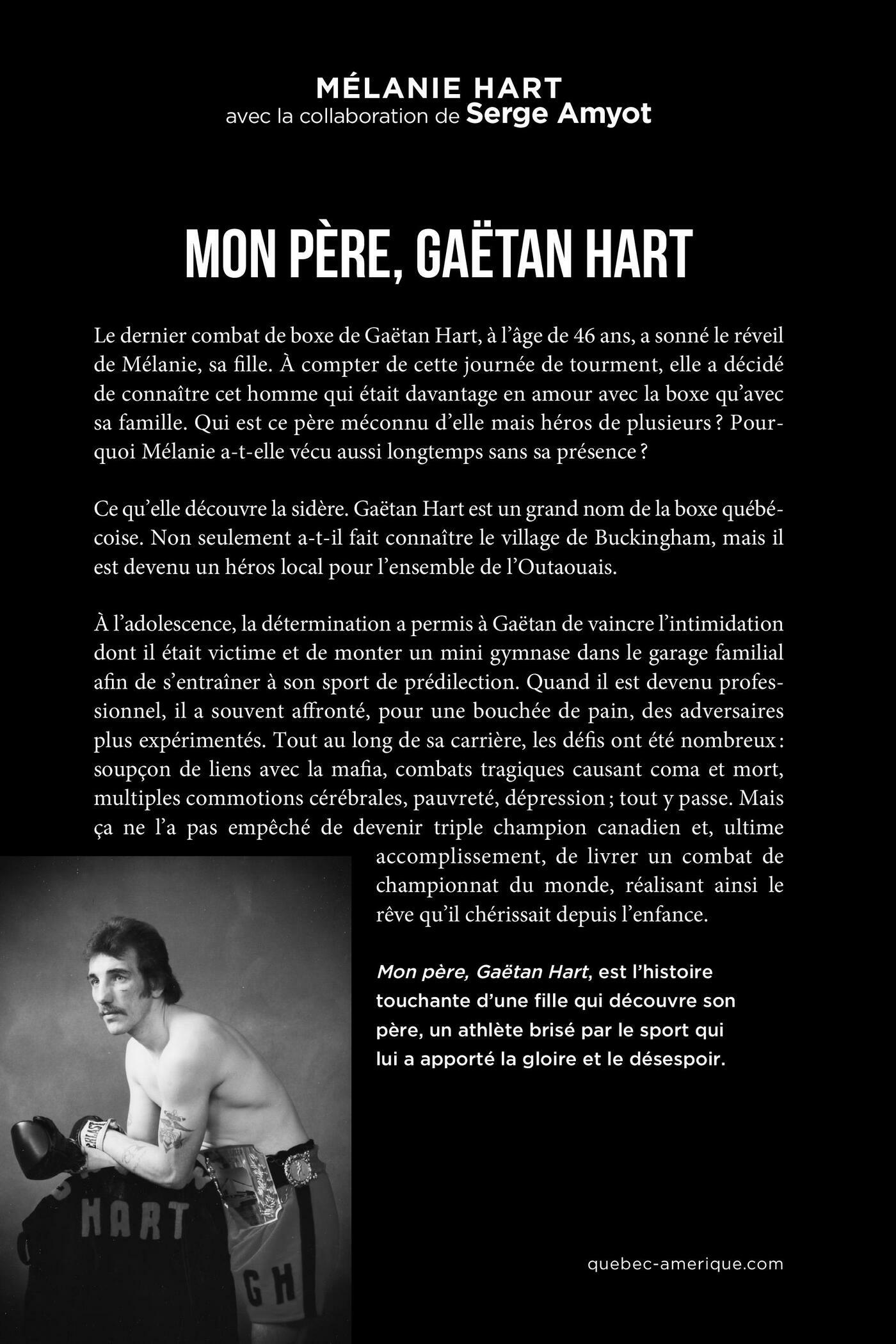 Le dernier combat de boxe de Gaëtan Hart, à l’âge de 46 ans, a sonné le réveil de Mélanie, sa fille. À compter de cette journée de tourment, elle a décidé de connaître cet homme qui était davantage en amour avec la boxe qu’avec sa famille. Qui est ce père méconnu d’elle mais héros de plusieurs? Pourquoi Mélanie a-t-elle vécu aussi longtemps sans sa présence ?Ce qu’elle découvre la sidère. Gaëtan Hart est un grand nom de la boxe québécoise. Non seulement a-t-il fait connaître le village de Buckingham, mais il est devenu un héros local pour l’ensemble de l’Outaouais.À l’adolescence, la détermination a permis à Gaëtan de vaincre l’intimidation dont il était victime et de monter un mini gymnase dans le garage familial afin de s’entraîner à son sport de prédilection. Quand il est devenu professionnel, il a souvent affronté, pour une bouchée de pain, des adversaires plus expérimentés. Tout au long de sa carrière, les défis ont été nombreux : soupçon de liens avec la mafia, combats tragiques causant coma et mort, multiples commotions cérébrales, pauvreté, dépression ; tout y passe. Mais ça ne l’a pas empêché de devenir triple champion canadien et, ultime accomplissement, de livrer un combat de championnat du monde, réalisant ainsi le rêve qu’il chérissait depuis l’enfance.Mon père, Gaëtan Hart, est l’histoire touchante d’une fille qui découvre son père, un athlète brisé par le sport qui lui a apporté la gloire et le désespoir.