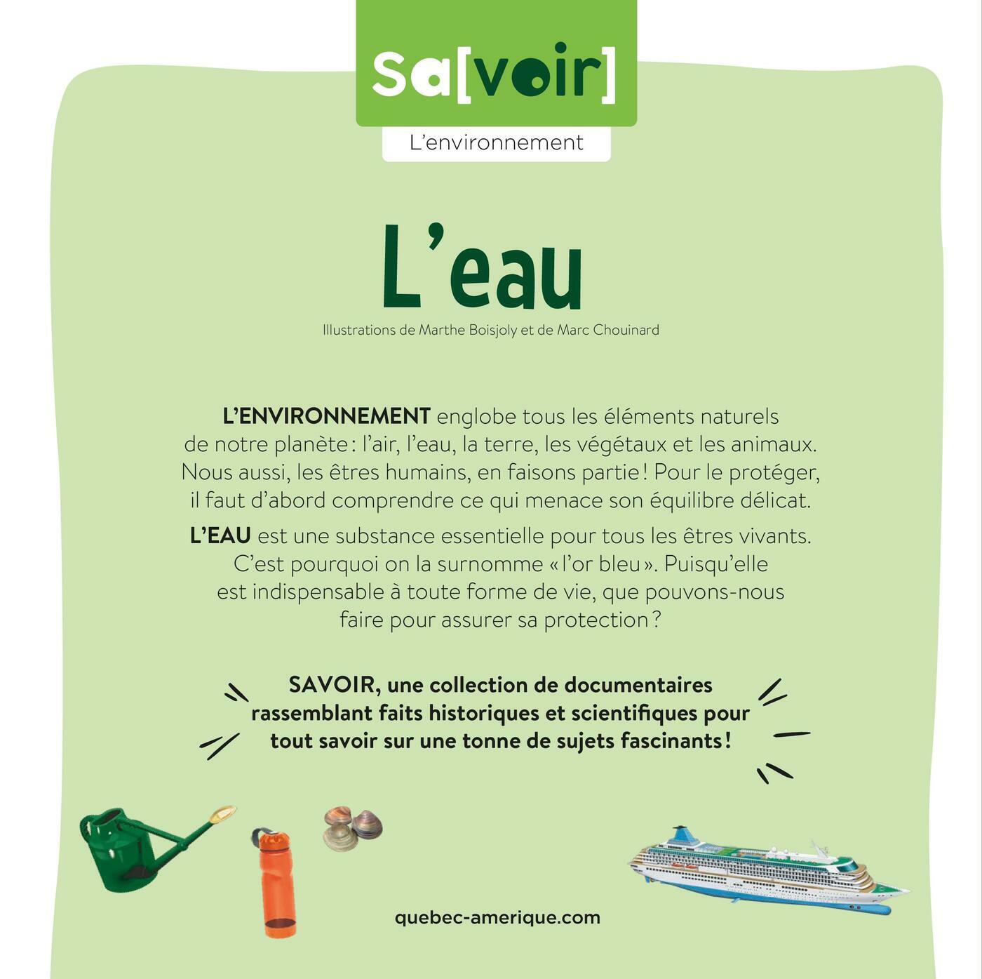 L’ENVIRONNEMENT englobe tous les éléments naturels de notre planète : l’air, l’eau, la terre, les végétaux et les animaux. Nous aussi, les êtres humains, en faisons partie ! Pour le protéger,il faut d’abord comprendre ce qui menace son équilibre délicat.L’EAU est une substance essentielle pour tous les êtres vivants. C’est pourquoi on la surnomme « l’or bleu ». Puisqu’elle est indispensable à toute forme de vie, que pouvons-nous faire pour assurer sa protection ?SAVOIR, une collection de documentaires rassemblant faits historiques et scientifiques pour tout savoir sur une tonne de sujets fascinants !