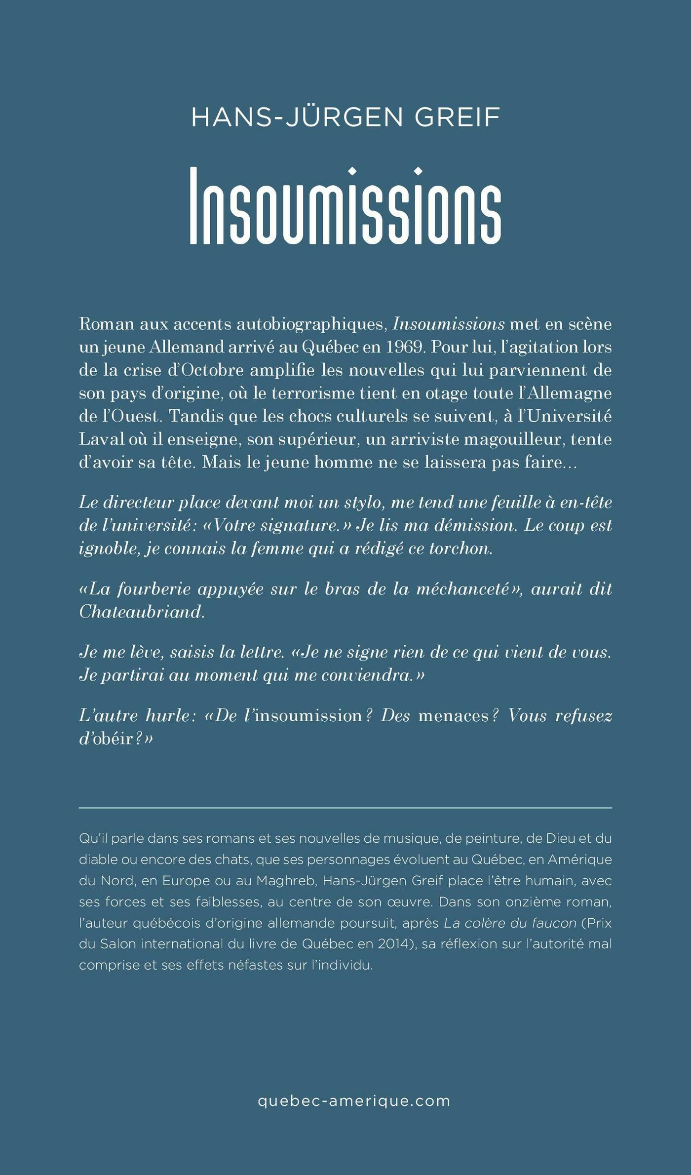 Roman aux accents autobiographiques, Insoumissions met en scèneun jeune Allemand arrivé au Québec en 1969. Pour lui, l’agitation lorsde la crise d’Octobre amplifie les nouvelles qui lui parviennent deson pays d’origine, où le terrorisme tient en otage toute l’Allemagnede l’Ouest. Tandis que les chocs culturels se suivent, à l’UniversitéLaval où il enseigne, son supérieur, un arriviste magouilleur, tented’avoir sa tête. Mais le jeune homme ne se laissera pas faire…Le directeur place devant moi un stylo, me tend une feuille à en-têtede l’université : « Votre signature. » Je lis ma démission. Le coup estignoble, je connais la femme qui a rédigé ce torchon.« La fourberie appuyée sur le bras de la méchanceté », aurait ditChateaubriand.Je me lève, saisis la lettre. « Je ne signe rien de ce qui vient de vous.Je partirai au moment qui me conviendra. »L’autre hurle : « De l’insoumission ? Des menaces ? Vous refusezd’obéir ? »