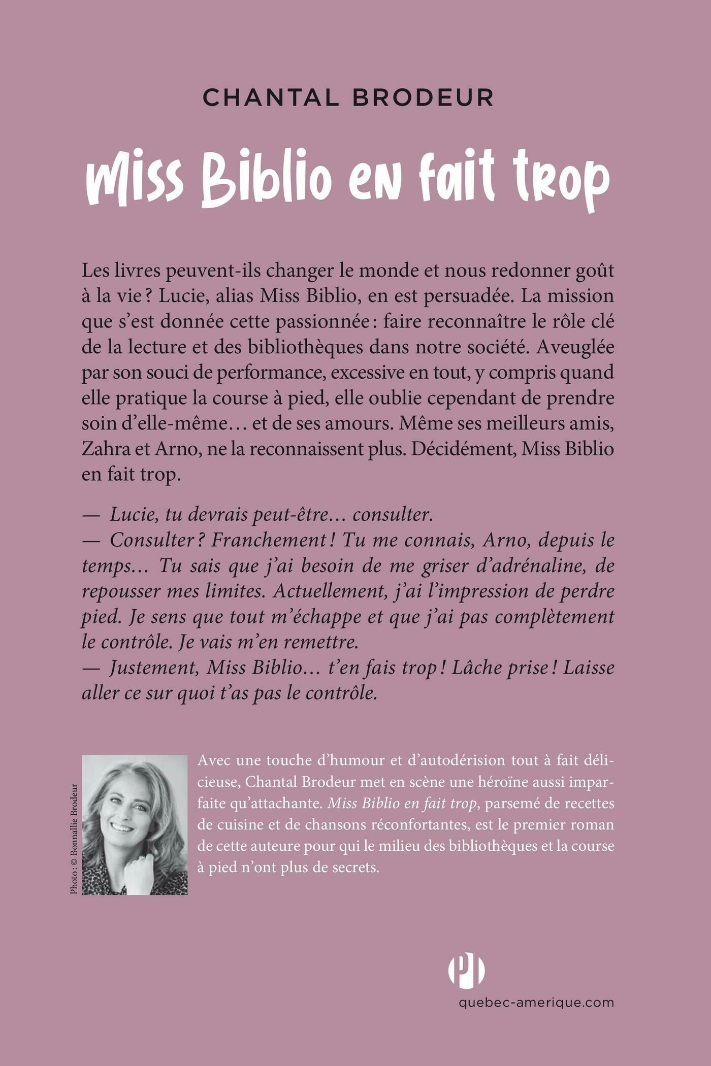 Les livres peuvent-ils changer le monde et nous redonner goût à la vie ? Lucie, alias Miss Biblio, en est persuadée. La mission que s’est donnée cette passionnée : faire reconnaître le rôle clé de la lecture et des bibliothèques dans notre société. Aveuglée par son souci de performance, excessive en tout, y compris quand elle pratique la course à pied, elle oublie cependant de prendre soin d’elle-même… et de ses amours. Même ses meilleurs amis, Zahra et Arno, ne la reconnaissent plus. Décidément, Miss Biblio en fait trop.— Lucie, tu devrais peut-être… consulter.— Consulter ? Franchement ! Tu me connais, Arno, depuis le temps… Tu sais que j’ai besoin de me griser d’adrénaline, de repousser mes limites. Actuellement, j’ai l’impression de perdre pied. Je sens que tout m’échappe et que j’ai pas complètement le contrôle. Je vais m’en remettre.— Justement, Miss Biblio… t’en fais trop ! Lâche prise ! Laisse aller ce sur quoi tu n’as pas le contrôle.Avec une touche d’humour et d’autodérision tout à fait délicieuse, Chantal Brodeur met en scène une héroïne aussi imparfaite qu’attachante. Miss Biblio en fait trop, parsemé de recettes de cuisine et de chansons réconfortantes, est le premier roman de cette auteure pour qui le milieu des bibliothèques et la course à pied n’ont plus de secrets.