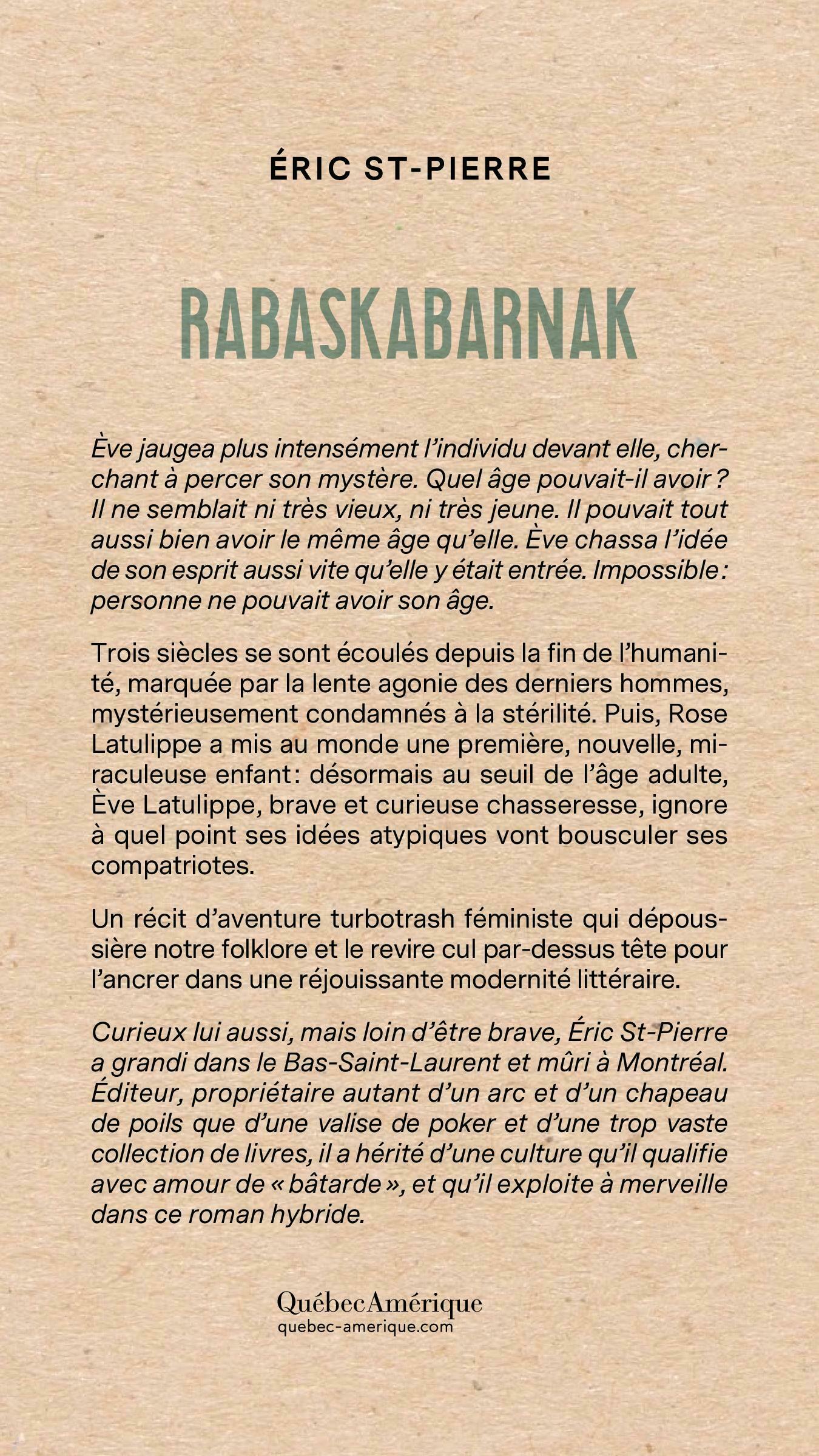 Ève jaugea plus intensément l’individu devant elle, cherchant à percer son mystère. Quel âge pouvait-il avoir? Il ne semblait ni très vieux, ni très jeune. Il pouvait tout aussi bien avoir le même âge qu’elle. Ève chassa l’idée de son esprit aussi vite qu’elle y était entrée. Impossible : personne ne pouvait avoir son âge. Trois siècles se sont écoulés depuis la fin de l’humanité, marquée par la lente agonie des derniers hommes, mystérieusement condamnés à la stérilité. Puis, Rose Latulippe a mis au monde une première, nouvelle, miraculeuse enfant : désormais au seuil de l’âge adulte, Ève Latulippe, brave et curieuse chasseresse, ignore à quel point ses idées atypiques vont bousculer ses compatriotes. Un récit d’aventure turbotrash féministe qui dépoussière notre folklore et le revire cul par-dessus tête pour l’ancrer dans une réjouissante modernité littéraire.