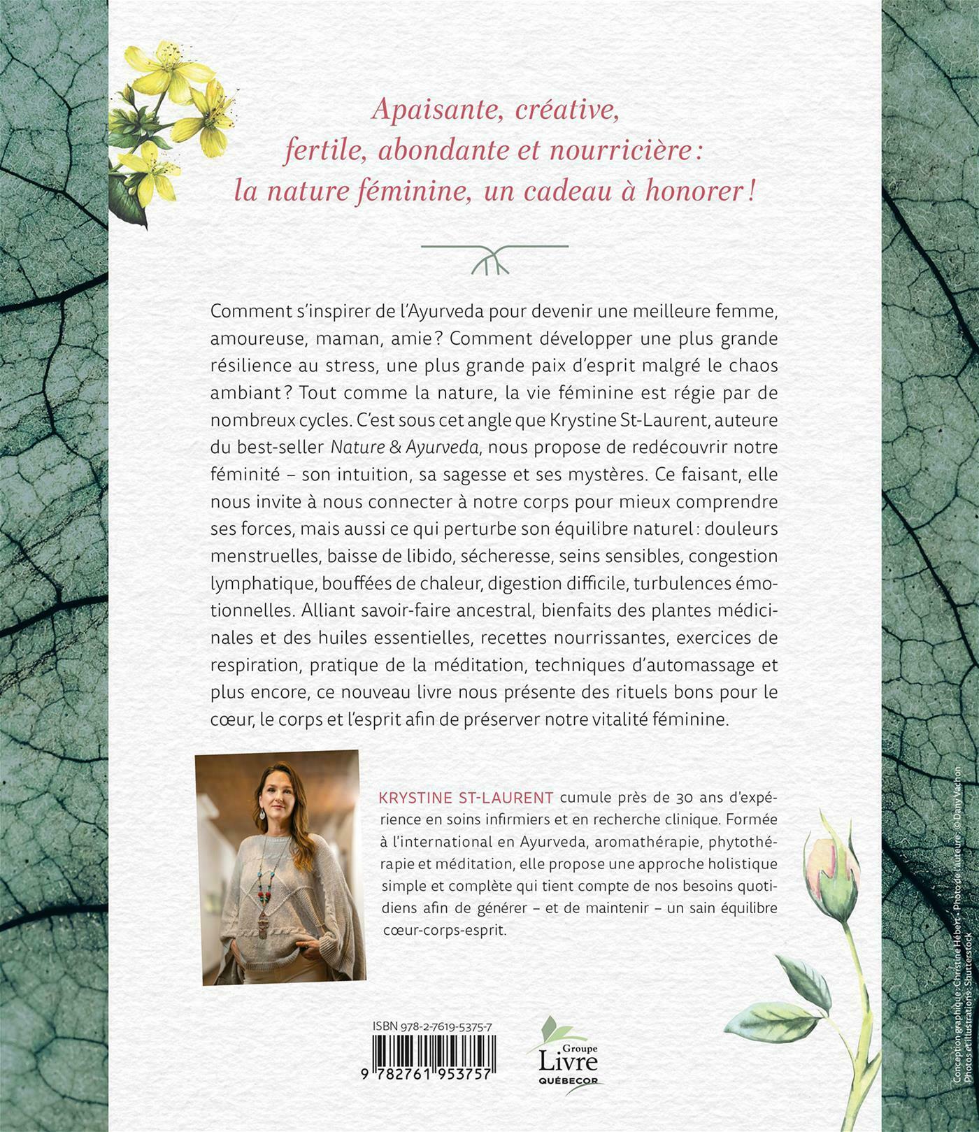 Tout comme la nature, la vie féminine est régie par de nombreux cycles. C'est sous cet angle que Krystine St-Laurent, auteure du best-seller Nature & Ayurveda, nous propose de redécouvrir notre féminité – son intuition, sa sagesse et ses mystères. Ce faisant, elle nous invite à nous connecter à notre corps pour mieux comprendre ses forces, mais aussi ce qui perturbe son équilibre naturel: douleurs menstruelles, baisse de libido, sécheresse, seins sensibles, congestion lymphatique, bouffées de chaleur, digestion difficile, turbulences émotionnelles.