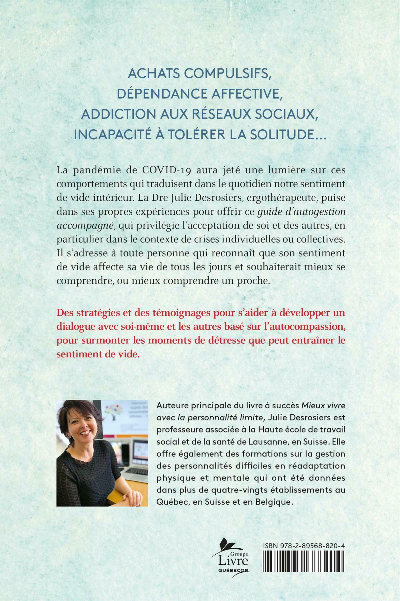 La pandémie de COVID-19 aura jeté une lumière sur ces comportements qui traduisent dans le quotidien notre sentiment de vide intérieur. La Dre Julie Desrosiers, ergothérapeute, puise dans ses propres expériences pour offrir ce guide d'autogestion accompagné, qui privilégie l'acceptation de soi et des autres, en particulier dans le contexte de crises individuelles ou collectives. Il s'adresse à toute personne qui reconnaît que son sentiment de vide affecte sa vie de tous les jours et souhaiterait mieux se comprendre, ou mieux comprendre un proche.