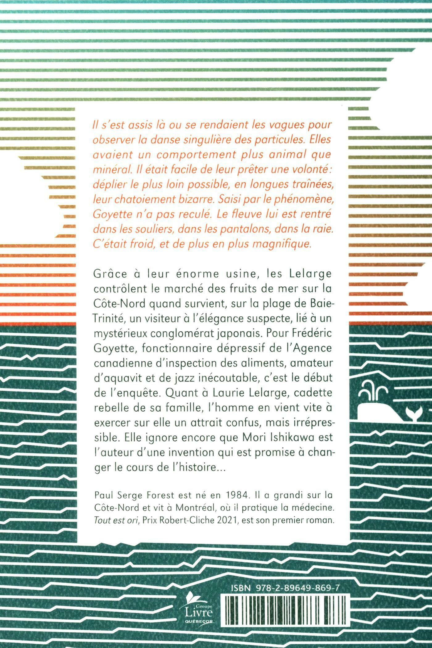 Grâce à leur énorme usine, les Lelarge contrôlent le marché des fruits de mer sur la Côte-Nord quand survient, sur la plage de Baie-Trinité, un visiteur à l'élégance suspecte, lié à un mystérieux conglomérat japonais. Pour Frédéric Goyette, fonctionnaire dépressif, amateur d'aquavit et de jazz inécoutable, c'est le début de l'enquête. Quant à Laurie Lelarge, cadette rebelle de sa famille, l'homme en vient vite à exercer sur elle un attrait confus, mais irrépressible. Elle ignore encore que Mori Ishikawa est l'auteur d'une invention qui est promise à changer le cours de l'histoire...