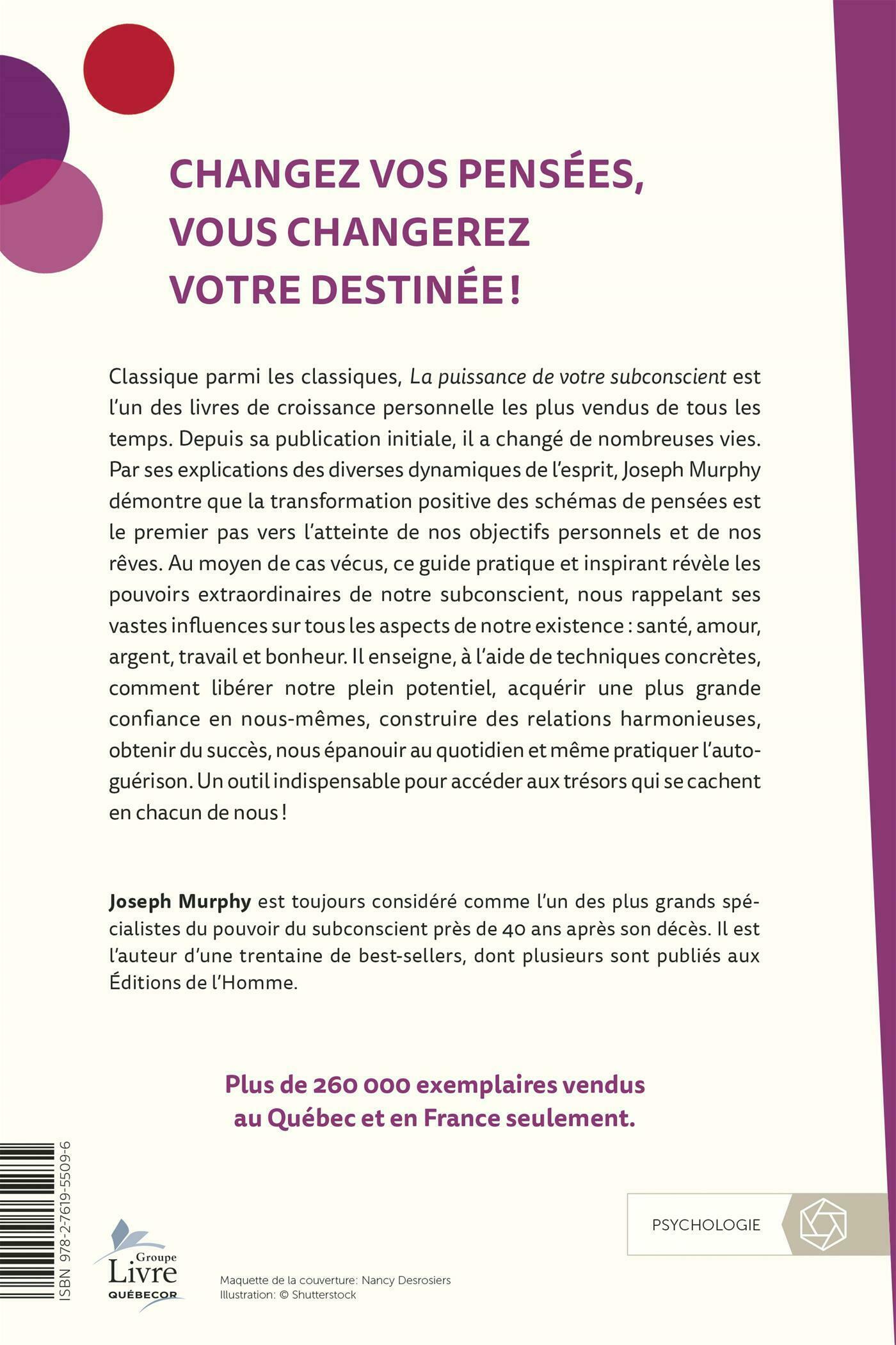 l'un des livres de croissance personnelle les plus vendus de tous les temps. Depuis sa publication initiale, il a changé de nombreuses vies. Par ses explications des diverses dynamiques de l'esprit, Joseph Murphy démontre que la transformation positive des schémas de pensées est le premier pas vers l'atteinte de nos objectifs personnels et de nos rêves. Au moyen de cas vécus, ce guide pratique et inspirant révèle les pouvoirs extraordinaires de notre subconscient, nous rappelant ses vastes influences sur tous les aspects de notre existence: santé, amour, argent, travail et bonheur. Il enseigne, à l'aide de techniques concrètes, comment libérer notre plein potentiel, acquérir une plus grande confiance en nous-mêmes, construire des relations harmonieuses, obtenir du succès, nous épanouir au quotidien et même pratiquer l'autoguérison. Un outil indispensable pour accéder aux trésors qui se cachent en chacun de nous!
