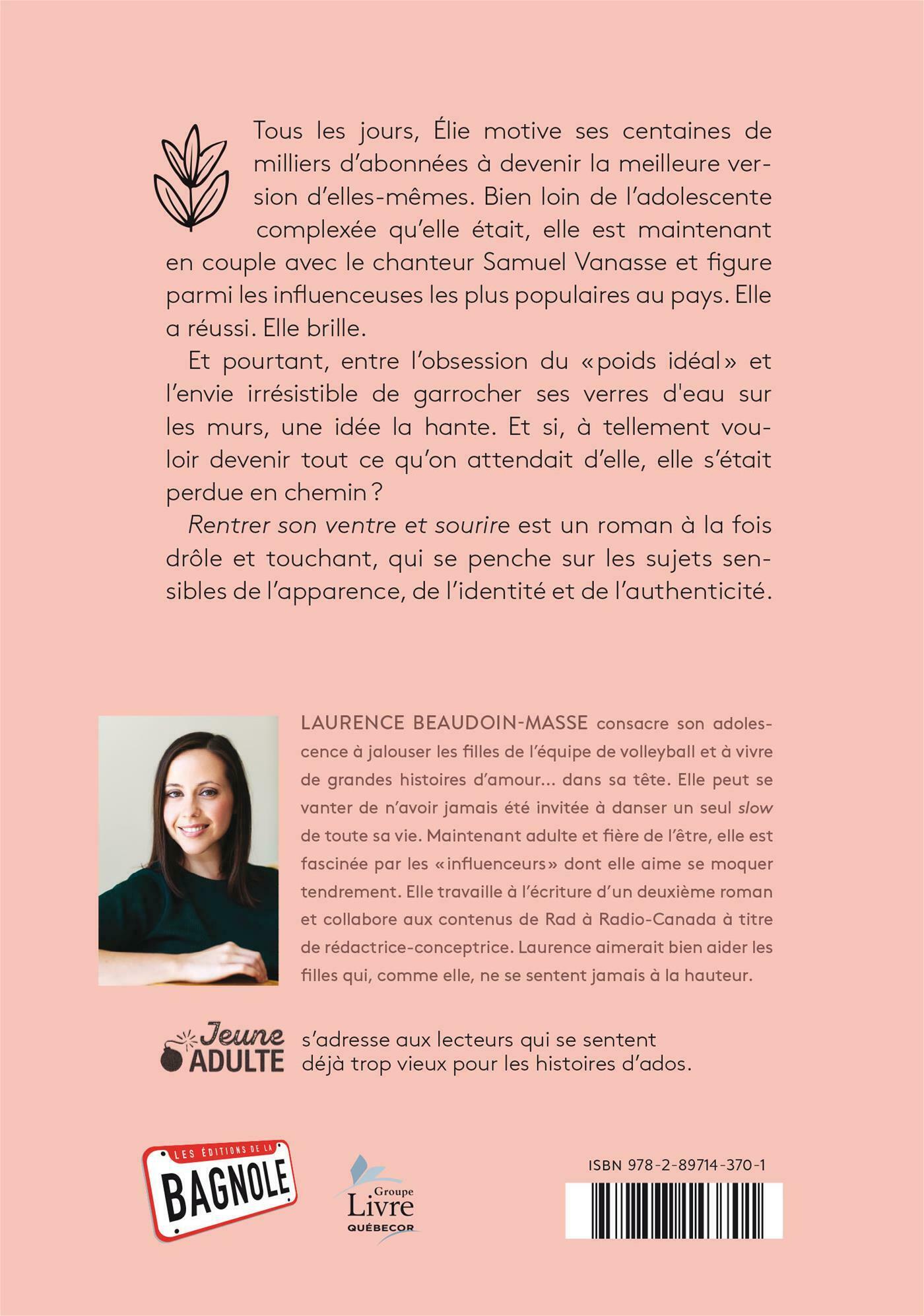 Tous les jours, Élie motive ses centaines de milliers d'abonnées à devenir la meilleure version d'elles-mêmes. Bien loin de l'adolescente complexée qu'elle était, elle est maintenant en couple avec le chanteur Samuel Vanasse et figure parmi les influenceuses les plus populaires au pays. Elle a réussi. Elle brille. Et pourtant, entre l'obsession du « poids idéal » et l'envie irrésistible de garrocher ses verres d'eau sur les murs, une idée la hante. Et si, à tellement vouloir devenir tout ce qu'on attendait d'elle, elle s'était perdue en chemin ? Rentrer son ventre et sourire est un roman à la fois drôle et touchant, qui se penche sur les sujets sensibles de l'apparence, de l'identité et de l'authenticité.
