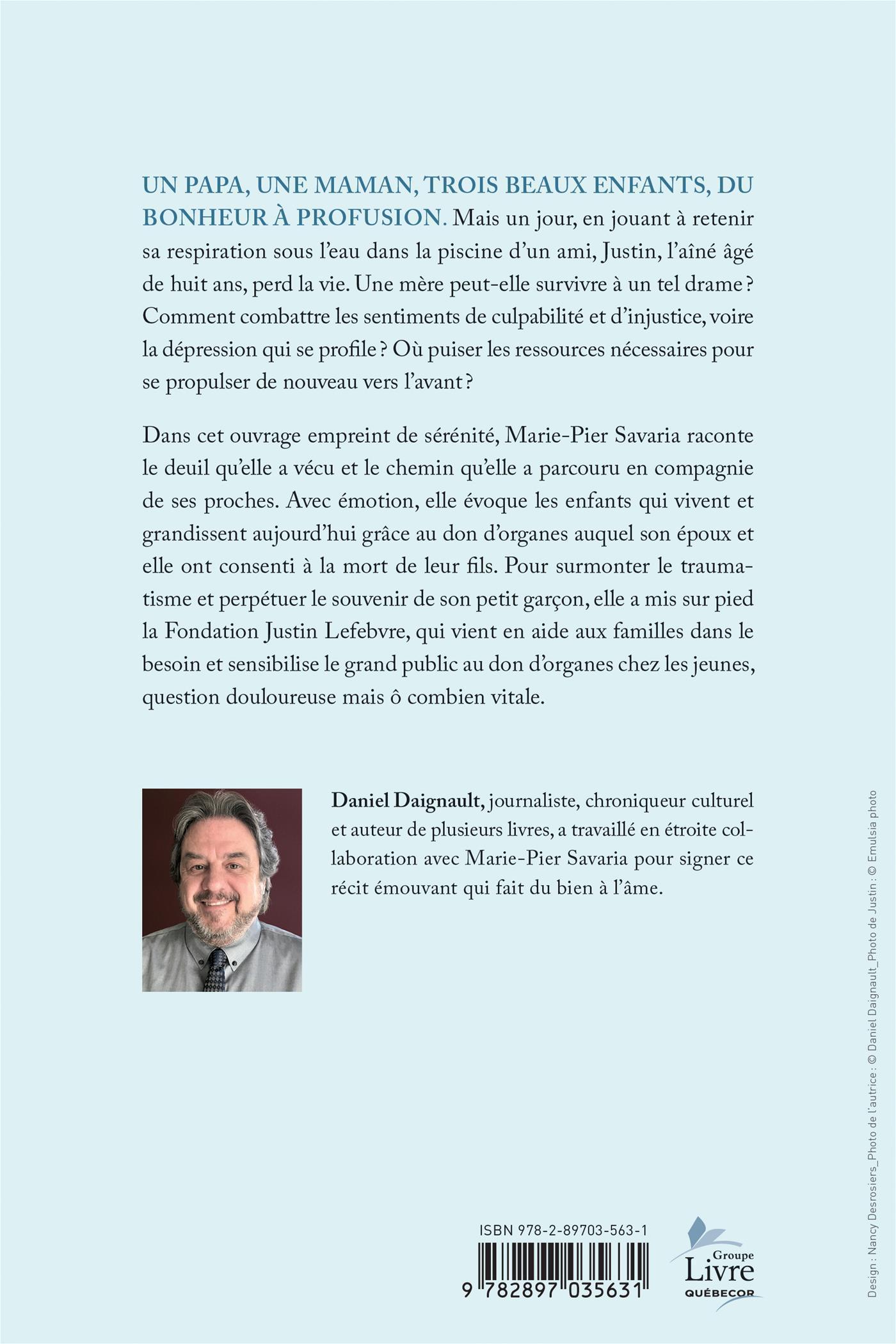 Dans cet ouvrage empreint de sérénité, Marie-Pier Savaria raconte le deuil qu'elle a vécu et le chemin qu'elle a parcouru en compagnie de ses proches. Avec émotion, elle évoque les enfants qui vivent et grandissent aujourd'hui grâce au don d'organes auquel son époux et elle ont consenti à la mort de leur fils. Pour surmonter le traumatisme et perpétuer le souvenir de son petit garçon, elle a mis sur pied la Fondation Justin Lefebvre, qui vient en aide aux familles dans le besoin et sensibilise le grand public au don d'organes chez les jeunes, question douloureuse mais ô combien vitale.