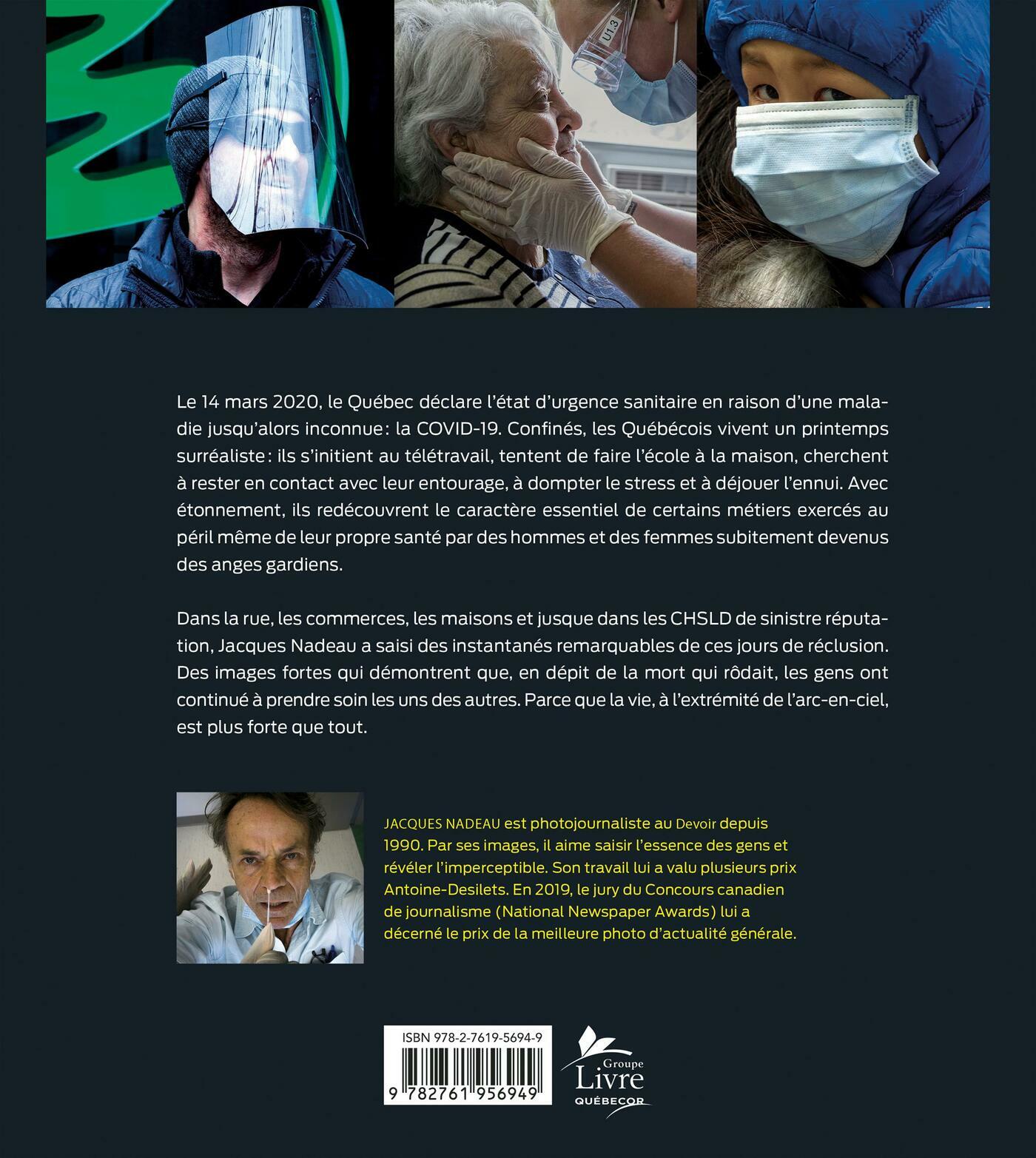 Dans la rue, les commerces, les maisons et jusque dans les CHSLD de sinistre réputation, Jacques Nadeau a saisi des instantanés remarquables de ces jours de réclusion. Des images fortes qui démontrent que, en dépit de la mort qui rôdait, les gens ont continué à prendre soin les uns des autres. Parce que la vie, à l'extrémité de l'arc-en-ciel, est plus forte que tout.