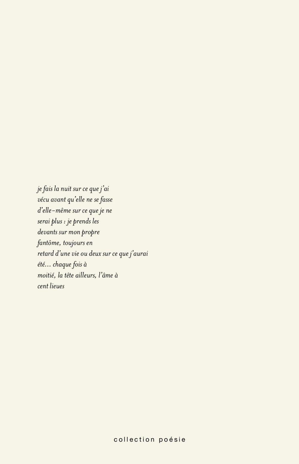 Dans ce nouvel opus, le poète primé Pierre Ouellet se livre à une exploration détaillée de la finitude qui nous guette depuis le premier jour et de la dépossession de l’être. Dans une langue scandée, au rythme envoûtant, qui se déploie au fil des pages sans jamais déroger à une universalité choisie du propos, il s’applique à déconstruire la mort annoncée du sujet. Comment dépasser sa propre fin ? Les mots peuvent-ils nous sauver ? L’écriture renvoie sans cesse le poète à sa finitude, jusqu’à l’apaisement, le renouement avec le soi, ses doubles et ses fantômes.
