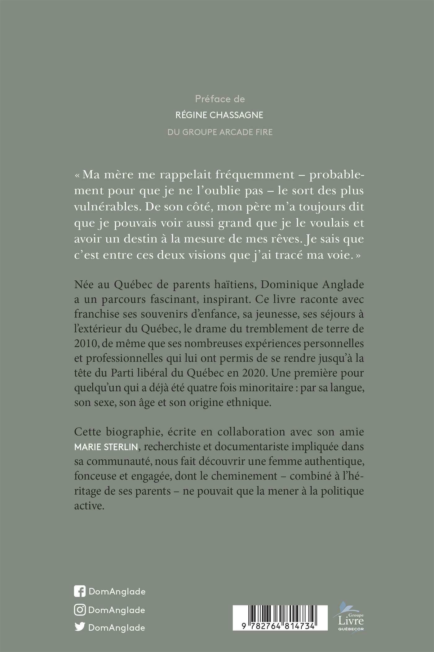 Née au Québec de parents haïtiens, Dominique Anglade a un parcours fascinant, inspirant. Ce livre raconte avec franchise ses souvenirs d'enfance, sa jeunesse, ses séjours à l'extérieur du Québec, le drame du tremblement de terre de 2010, de même que ses nombreuses expériences personnelles et professionnelles qui lui ont permis de se rendre jusqu'à la tête du Parti libéral du Québec en 2020. Une première pour quelqu'un qui a déjà été quatre fois minoritaire : par sa langue, son sexe, son âge et son origine ethnique.