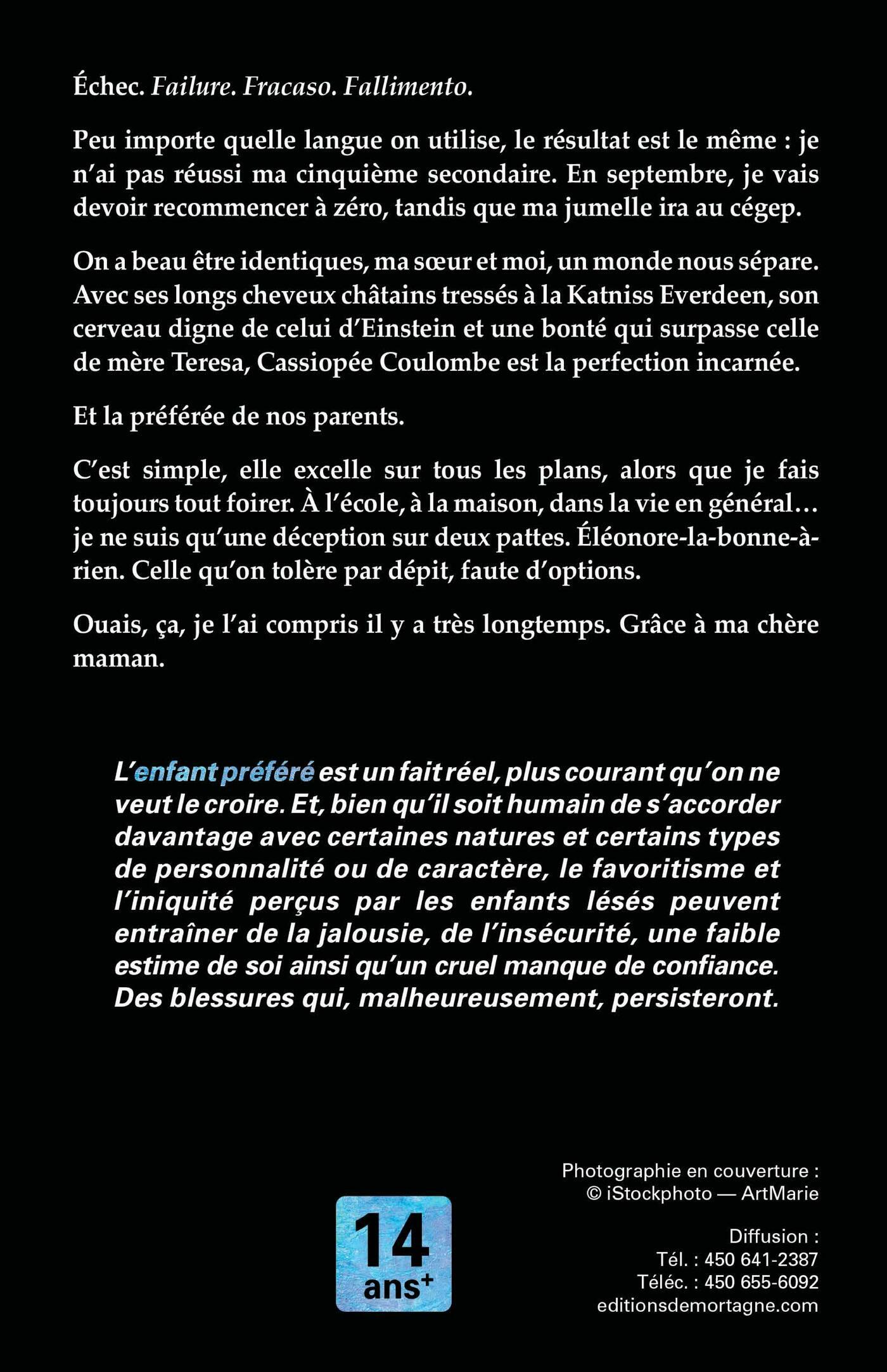 Échec. Failure. Fracaso. Fallimento.Peu importe quelle langue on utilise, le résultat est le même : je n’ai pas réussi ma cinquième secondaire. En septembre, je vais devoir recommencer à zéro, tandis que ma jumelle ira au cégep. On a beau être identiques, ma sœur et moi, un monde nous sépare. Avec ses longs cheveux châtains tressés à la Katniss Everdeen, son cerveau digne de celui d’Einstein et une bonté qui surpasse celle de mère Teresa, Cassiopée Coulombe est la perfection incarnée.Et la préférée de nos parents.C’est simple, elle excelle sur tous les plans, alors que je fais toujours tout foirer. À l’école, à la maison, dans la vie en général… je ne suis qu’une déception sur deux pattes. Éléonore-la-bonne-à-rien. Celle qu’on tolère par dépit, faute d’options.Ouais, ça, je l’ai compris il y a très longtemps. Grâce à ma chère maman.L’enfant préféré est un fait réel, plus courant qu’on ne veut le croire. Et, bien qu’il soit humain de s’accorder davantage avec certaines natures, certains types de personnalité ou de caractère, le favoritisme et l’iniquité perçus par les enfants lésés peuvent entraîner de la jalousie, de l’insécurité, une faible estime de soi ainsi qu’un cruel manque de confiance. Des blessures qui, malheureusement, persisteront.