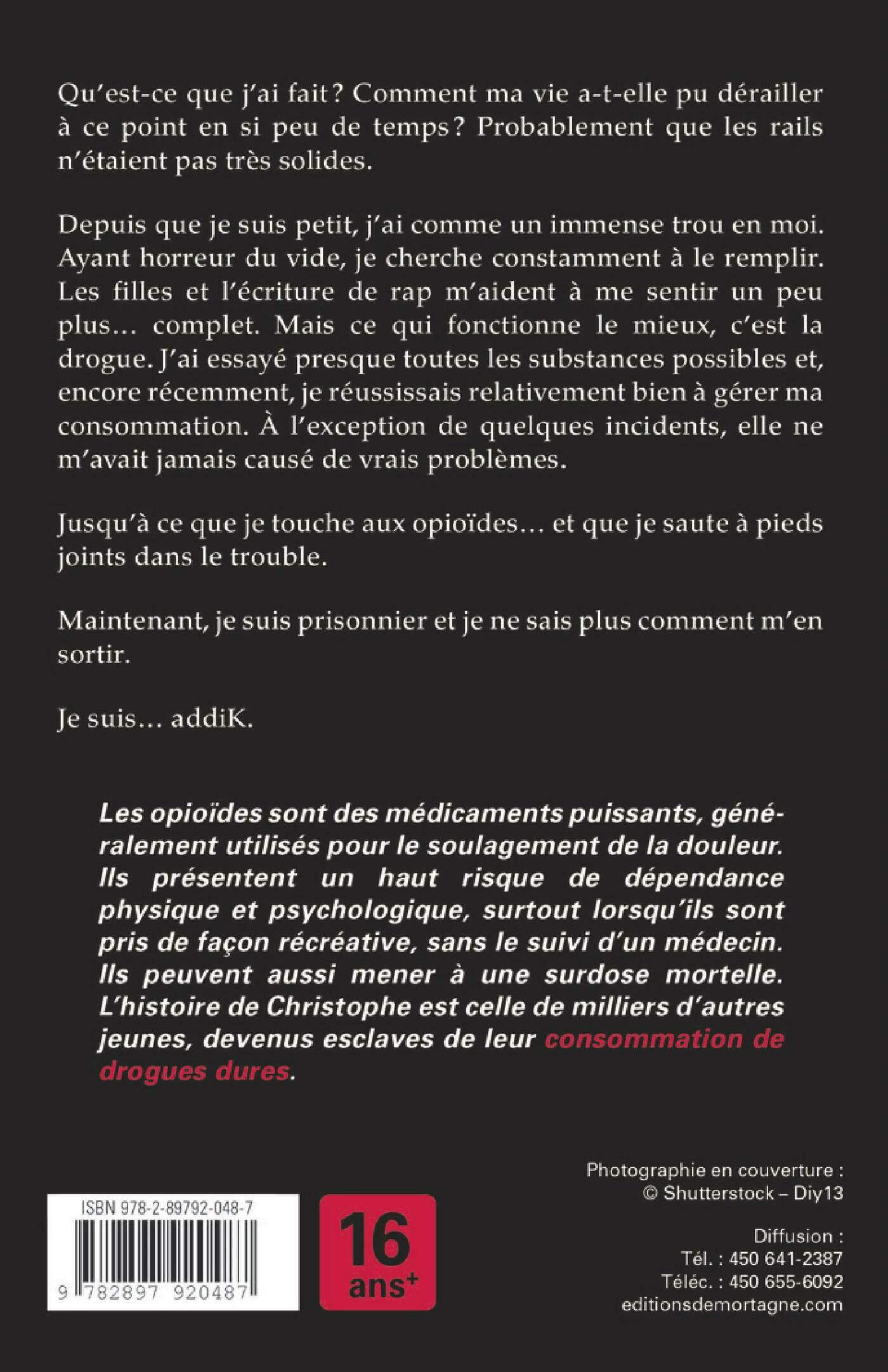 50e roman de la collection TABOU!Qu'est-ce que j'ai fait? Comment ma vie a-t-elle pu dérailler à ce point en si peu de temps? Probablement que les rails n'étaient pas très solides.Depuis que je suis petit, j’ai comme un immense trou en moi. Ayant horreur du vide, je cherche constamment à le remplir. Les filles et l'écriture de rap m'aident à me sentir un peu plus... complet. Mais ce qui fonctionne le mieux, c'est la drogue. J'ai essayé presque toutes les substances possibles et, encore récemment, je réussissais relativement bien à gérer ma consommation. À l'exception de quelques incidents, elle ne m'avait jamais causé de vrais problèmes.Jusqu’à ce que je touche aux opioïdes… et que je saute à pieds joints dans le trouble. Maintenant, je suis prisonnier et je ne sais plus comment m'en sortir. Je suis... addiK.Les opioïdes sont des médicaments puissants, généralement utilisés pour le soulagement de la douleur. Ils présentent un haut risque de dépendance physique et psychologique, surtout lorsqu’ils sont pris de façon récréative, sans le suivi d’un médecin. Ils peuvent aussi mener à une surdose mortelle. L’histoire de Christophe est celle de milliers d’autres jeunes, devenus esclaves de leur consommation de drogues dures.