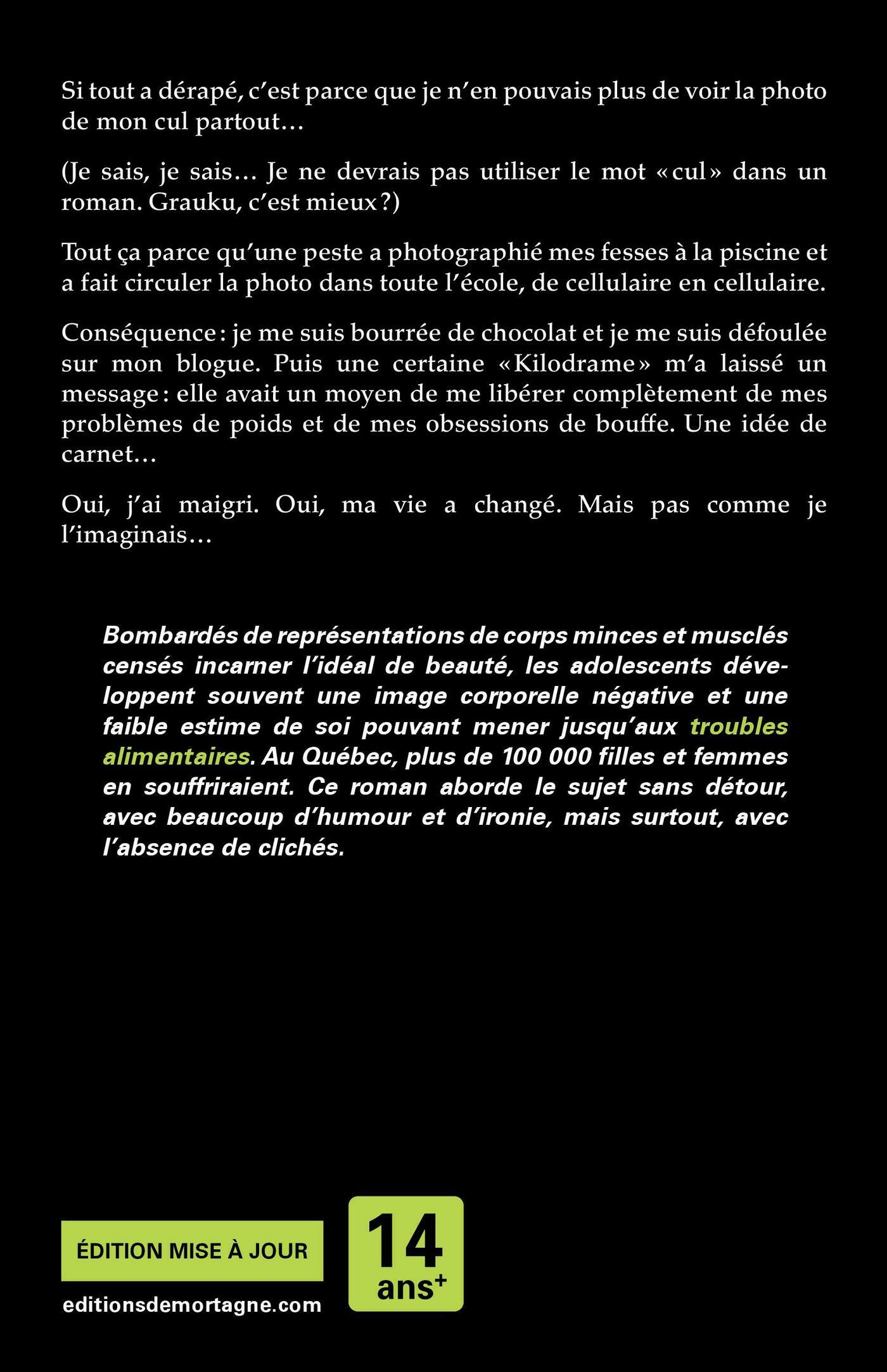 Si tout a dérapé, c’est parce que je n’en pouvais plus de voir la photo de mon cul partout… (Je sais, je sais… Je ne devrais pas utiliser le mot « cul » dans un roman. Grauku, c’est mieux ?)Tout ça parce qu’une peste a photographié mes fesses à la piscine et a fait circuler la photo dans toute l’école, de cellulaire en cellulaire. Conséquence : je me suis bourrée de chocolat et je me suis défoulée sur mon blogue. Puis une certaine « Kilodrame » m’a laissé un message : elle avait un moyen de me libérer complètement de mes problèmes de poids et de mes obsessions de bouffe. Une idée de carnet… Oui, j’ai maigri. Oui, ma vie a changé. Mais pas comme je l’imaginais… Bombardés de représentations de corps minces et musclés censés incarner l’idéal de beauté, les adolescents développent souvent une image corporelle négative et une faible estime de soi pouvant mener jusqu’aux troubles alimentaires. Au Québec, plus de 100 000 filles et femmes en souffriraient. Ce roman aborde le sujet sans détour, avec beaucoup d'humour et d'ironie, mais surtout, avec l’absence de clichés.
