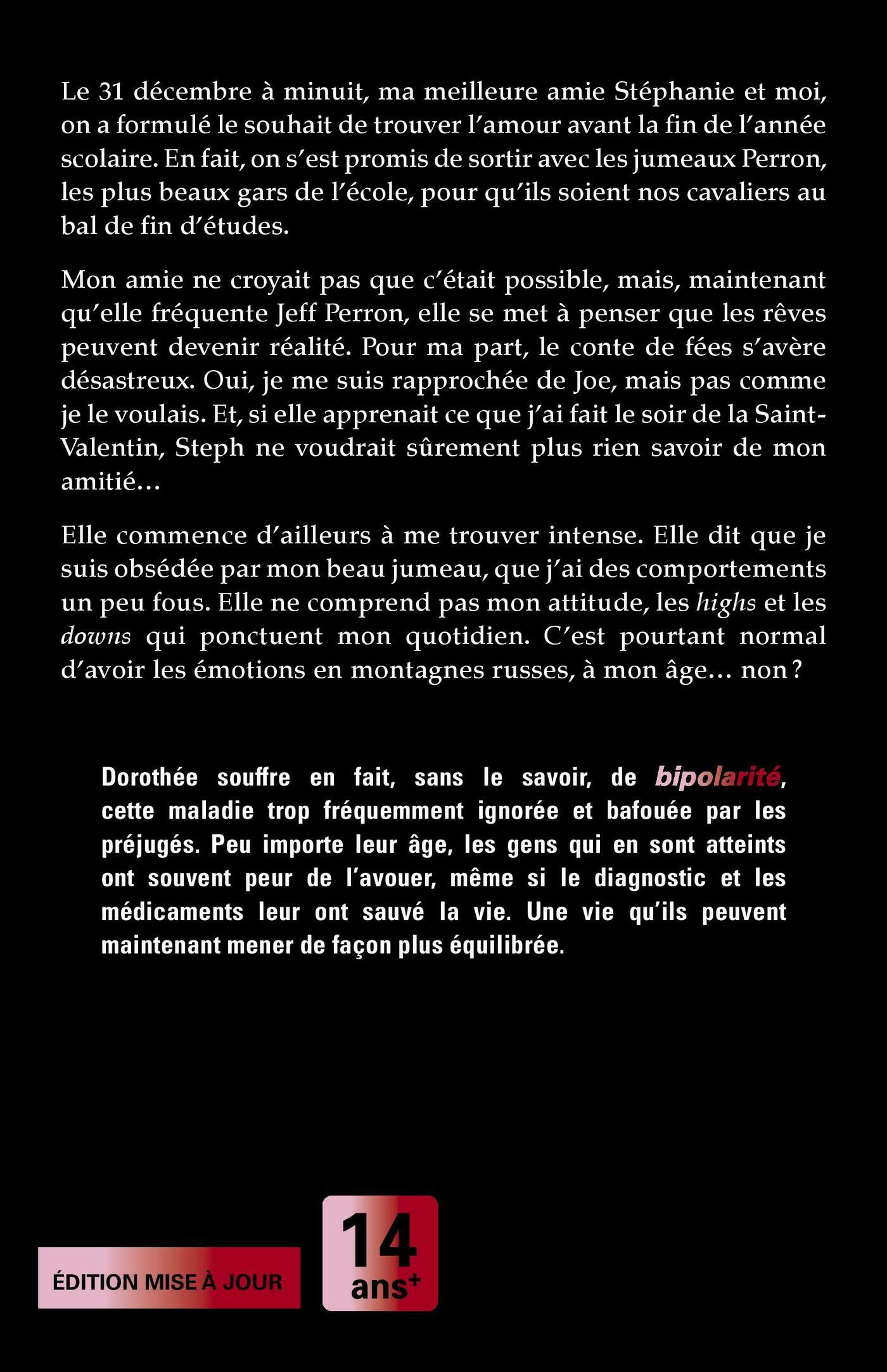 Le 31 décembre à minuit, ma meilleure amie Stéphanie et moi, on a formulé le souhait de trouver l’amour avant la fin de l’année scolaire. En fait, on s’est promis de sortir avec les jumeaux Perron, les plus beaux gars de l’école, pour qu’ils soient nos cavaliers au bal de fin d’études.Mon amie ne croyait pas que c’était possible, mais, maintenant qu’elle fréquente Jeff Perron, elle se met à penser que les rêves peuvent devenir réalité. Pour ma part, le conte de fées s’avère désastreux. Oui, je me suis rapprochée de Joe, mais pas comme je le voulais. Et, si elle apprenait ce que j’ai fait le soir de la Saint-Valentin, Steph ne voudrait sûrement plus rien savoir de mon amitié…Elle commence d’ailleurs à me trouver intense. Elle dit que je suis obsédée par mon beau jumeau, que j’ai des comportements un peu fous. Elle ne comprend pas mon attitude, les highs et les downs qui ponctuent mon quotidien. C’est pourtant normal d’avoir les émotions en montagnes russes, à mon âge… non ?Dorothée souffre en fait, sans le savoir, de bipolarité, cette maladie trop fréquemment ignorée et bafouée par les préjugés. Peu importe leur âge, les gens qui en sont atteints ont souvent peur de l’avouer, même si le diagnostic et les médicaments leur ont sauvé la vie. Une vie qu’ils peuvent maintenant mener de façon plus équilibrée.