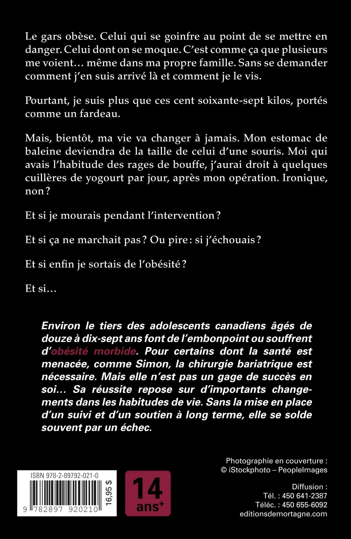 Le gars obèse. Celui qui se goinfre au point de se mettre en danger. Celui dont on se moque. C’est comme ça que plusieurs me voient… même dans ma propre famille. Sans se demander comment j’en suis arrivé là et comment je le vis.Pourtant, je suis plus que ces cent soixante-sept kilos, portés comme un fardeau.Mais, bientôt, ma vie va changer à jamais. Mon estomac de baleine deviendra de la taille de celui d’une souris. Moi qui avais l’habitude des rages de bouffe, j’aurai droit à quelques cuillères de yogourt par jour, après mon opération. Ironique, non ?Et si je mourais pendant l’intervention ?Et si ça ne marchait pas ? Ou pire : si j’échouais ?Et si enfin je sortais de l’obésité ?Et si…Environ le tiers des adolescents canadiens âgés de douze à dix-sept ans font de l’embonpoint ou souffrent d’obésité morbide. Pour certains dont la santé est menacée, comme Simon, la chirurgie bariatrique est nécessaire. Mais elle n’est pas un gage de succès en soi… Sa réussite repose sur d’importants changements dans les habitudes de vie. Sans la mise en place d’un suivi et d’un soutien à long terme, elle se solde souvent par un échec.