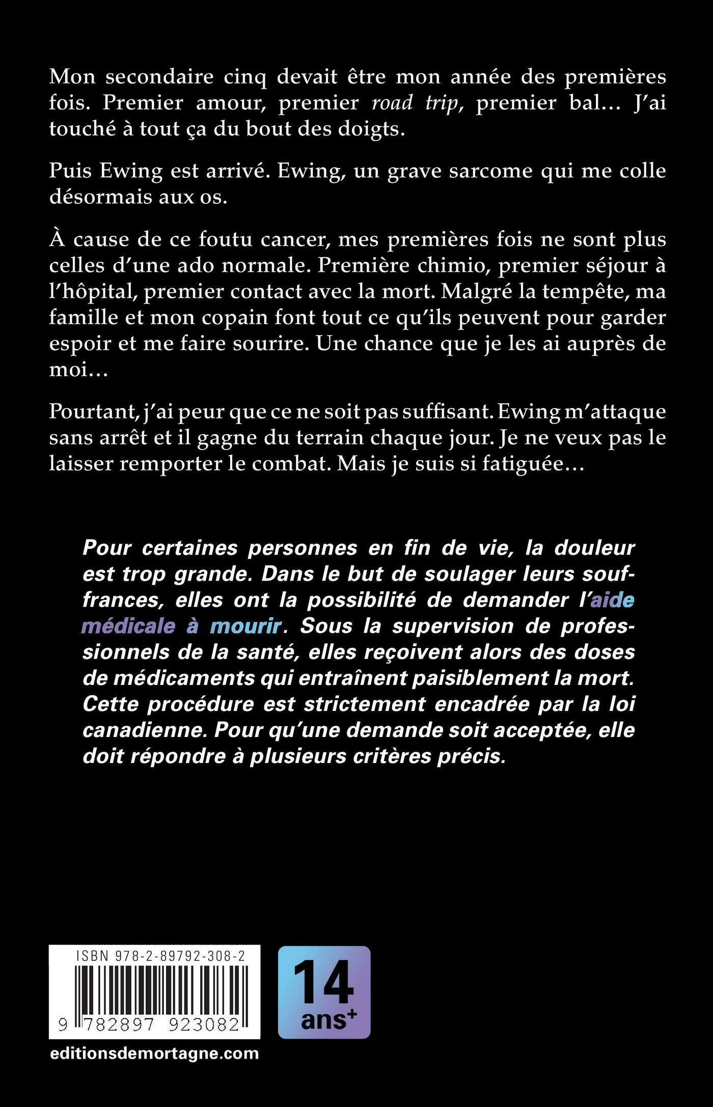 Mon secondaire cinq devait être mon année des premières fois. Premier amour, premier road trip, premier bal… J’ai touché à tout ça du bout des doigts. Puis Ewing est arrivé. Ewing, un grave sarcome qui me colle désormais aux os.À cause de ce foutu cancer, mes premières fois ne sont plus celles d’une ado normale. Première chimio, premier séjour à l’hôpital, premier contact avec la mort. Malgré la tempête, ma famille et mon copain font tout ce qu’ils peuvent pour garder espoir et me faire sourire. Une chance que je les ai auprès de moi…Pourtant, j’ai peur que ce ne soit pas suffisant. Ewing m’attaque sans arrêt et il gagne du terrain chaque jour. Je ne veux pas le laisser remporter le combat. Mais je suis si fatiguée…Pour certaines personnes en fin de vie, la douleur est trop grande. Dans le but de soulager leurs souffrances, elles ont la possibilité de demander l’aide médicale à mourir. Sous la supervision de professionnels de la santé, elles reçoivent alors des doses de médicaments qui entraînent paisiblement la mort. Cette procédure est strictement encadrée par la loi canadienne. Pour qu’une demande soit acceptée, elle doit répondre à plusieurs critères précis.
