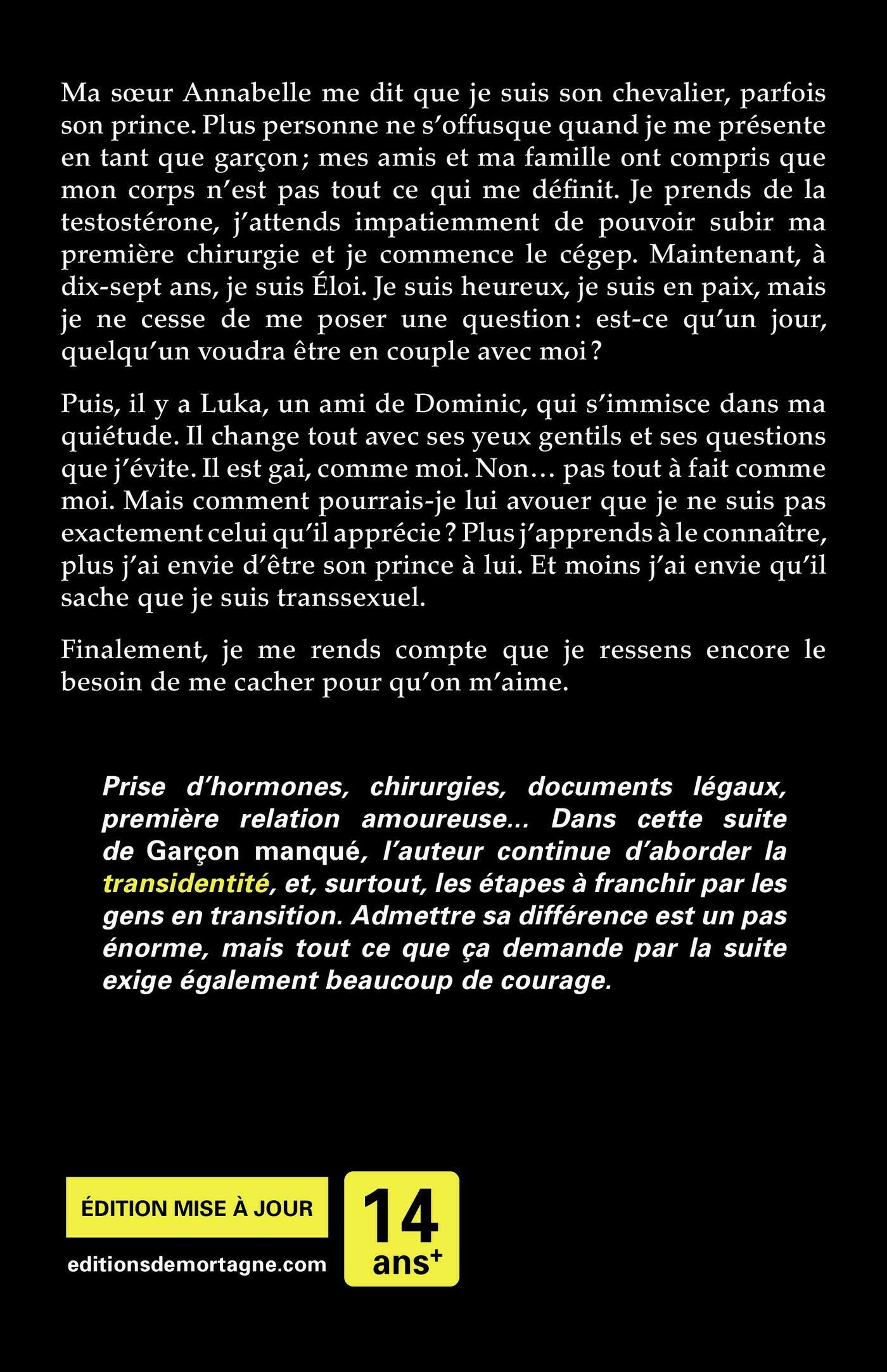 *Deuxième édition : nouvelle couverture, contenu identique*Ma soeur Annabelle me dit que je suis son chevalier, parfois son prince. Plus personne ne s’offusque quand je me présente en tant que garçon ; mes amis et ma famille ont compris que mon corps n’est pas tout ce qui me définit. Je prends de la testostérone, j’attends impatiemment de pouvoir subir ma première chirurgie et je commence le cégep. Maintenant, à dix-sept ans, je suis Éloi. Je suis heureux, je suis en paix, mais je ne cesse de me poser une question : est-ce qu’un jour, quelqu’un voudra être en couple avec moi ? Puis, il y a Luka, un ami de Dominic, qui s’immisce dans ma quiétude. Il change tout avec ses yeux gentils et ses questions que j’évite. Il est gai, comme moi. Non… pas tout à fait comme moi. Mais comment pourrais-je lui avouer que je ne suis pas exactement celui qu’il apprécie ? Plus j’apprends à le connaître, plus j’ai envie d’être son prince à lui. Et moins j’ai envie qu’il sache que je suis transsexuel. Finalement, je me rends compte que je ressens encore le besoin de me cacher pour qu’on m’aime.Prise d’hormones, chirurgies, documents légaux, première relation amoureuse... Dans cette suite de Garçon manqué, l’auteur continue d’aborder la transidentité, et, surtout, les étapes à franchir par les gens en transition. Admettre sa différence est un pas énorme, mais tout ce que ça demande par la suite exige également beaucoup de courage.