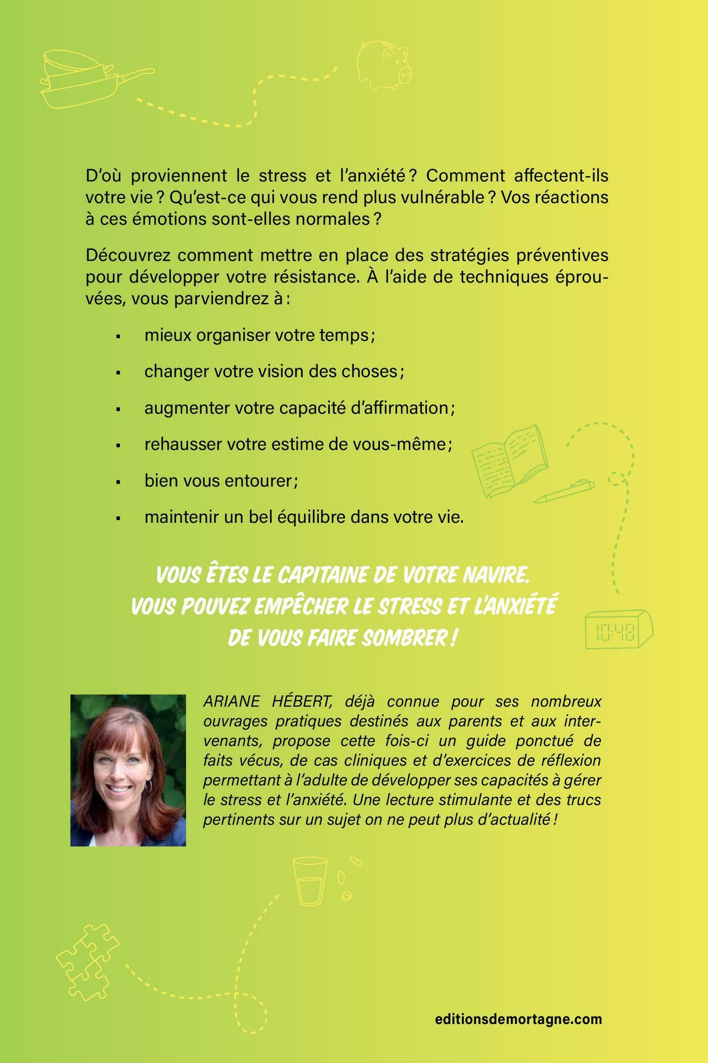 D’où proviennent le stress et l’anxiété ? Comment affectent-ils votre vie? Qu’est-ce qui vous rend plus vulnérable? Vos réactions à ces émotions sont-elles normales? Découvrez comment mettre en place des stratégies préventives pour développer votre résistance. À l’aide de techniques éprouvées, vous parviendrez à :-mieux organiser votre temps ; -changer votre vision des choses ; -augmenter votre capacité d’affirmation ; -rehausser votre estime de vous-même ; -bien vous entourer ; -maintenir un bel équilibre dans votre vie. Vous êtes le capitaine de votre navire. Vous pouvez empêcher le stress et l’anxiété de vous faire sombrer!Ariane Hébert, déjà connue pour ses nombreux ouvrages pratiques destinés aux parents et aux intervenants, propose cette fois-ci un guide ponctué de faits vécus, de cas cliniques et d’exercices de réflexion permettant à l’adulte de développer ses capacités à gérer le stress et l’anxiété. Une lecture stimulante et des trucs pertinents sur un sujet on ne peut plus d’actualité !