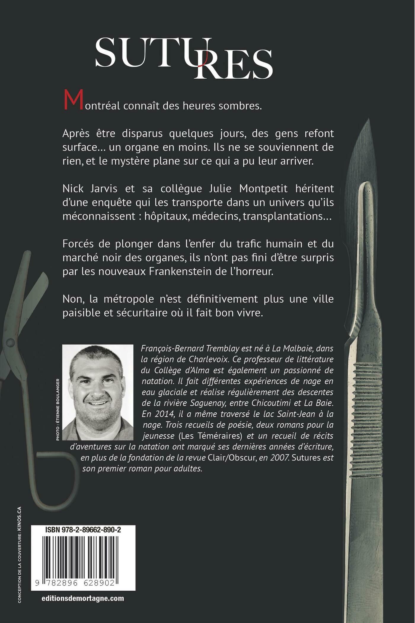 Montréal connaît des heures sombres. Après être disparus quelques jours, des gens refont surface… un organe en moins. Ils ne se souviennent de rien, et le mystère plane sur ce qui a pu leur arriver.Nick Jarvis et sa collègue Julie Montpetit héritent d'une enquête qui les transporte dans un univers qu'ils méconnaissent : hôpitaux, médecins, transplantations... Forcés de plonger dans l'enfer du trafic humain et du marché noir des organes, ils n'ont pas fini d'être surpris par les nouveaux Frankenstein de l'horreur.Non, la métropole n'est définitivement plus une ville paisible et sécuritaire où il fait bon vivre.François-Bernard Tremblay est né à La Malbaie, dans la région de Charlevoix. Ce professeur de littérature du Collège d'Alma est également un passionné de natation. Il fait différentes expériences de nage en eau glaciale et réalise régulièrement des descentes de la rivière Saguenay, entre Chicoutimi et La Baie. En 2014, il a même traversé le lac Saint-Jean à la nage. Trois recueils de poésie, deux romans pour la jeunesse (Les Téméraires) et un recueil de récits d'aventures sur la natation ont marqué ses dernières années d'écriture, en plus de la fondation de la revue Clair/Obscur, en 2007. Sutures est son premier roman pour adultes.